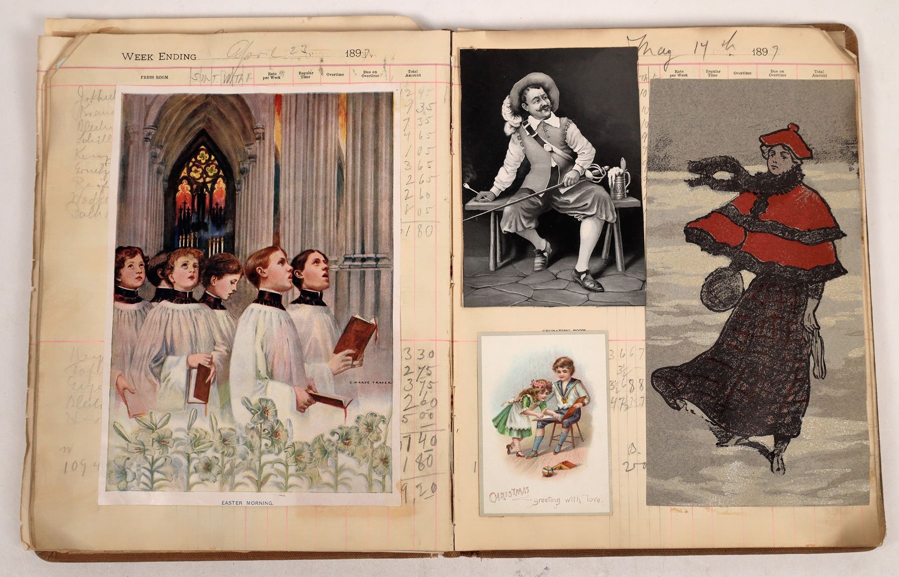 Helen Keye turned a 1896 Lithograph Department ledge into her scrapbook for trade cards, pictures and cutouts. Interesting assortment of artwork pasted into an account ledger.