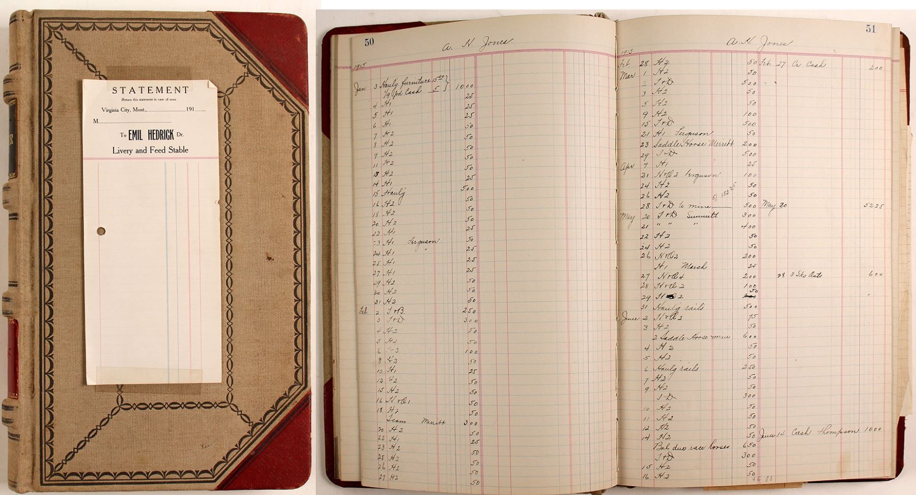 Ledger for Emil Hedrick, Dr., Livery & Feed Stable. 14.25" x 9". Good condition. HWAC# 57835 Date: Location: Virginia City, Montana