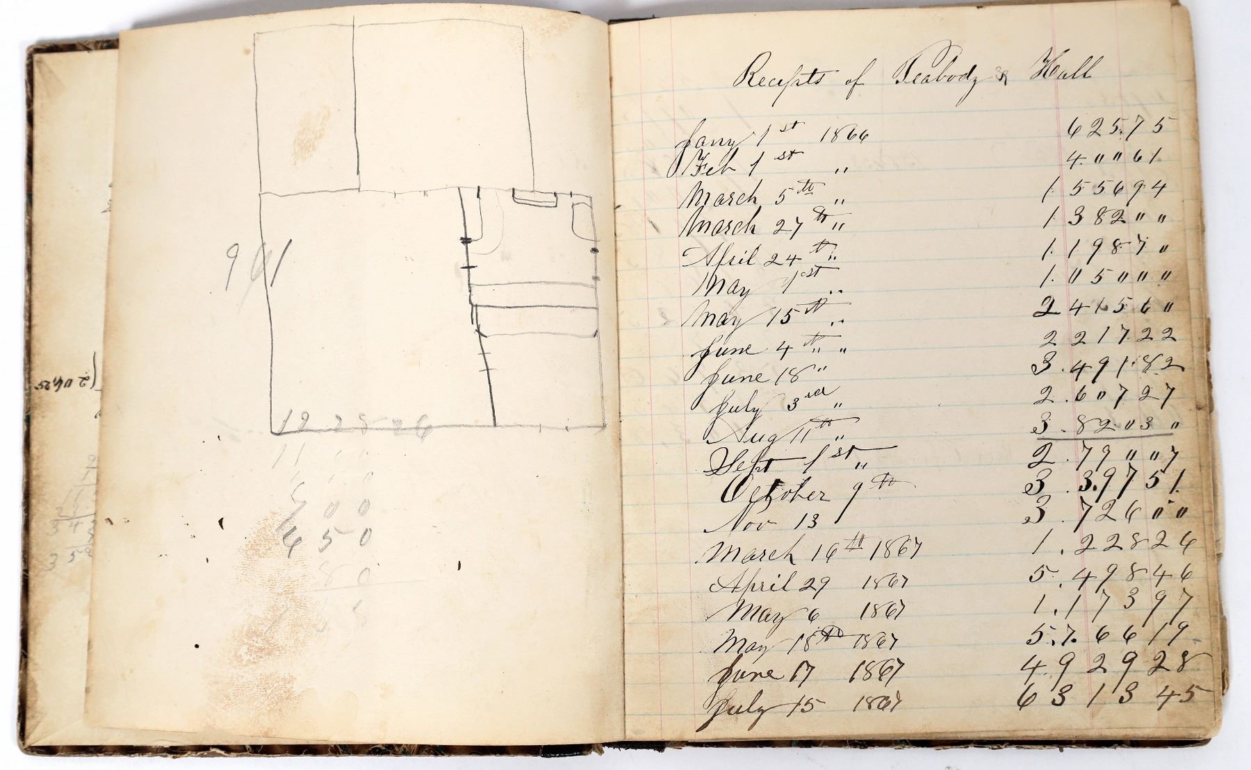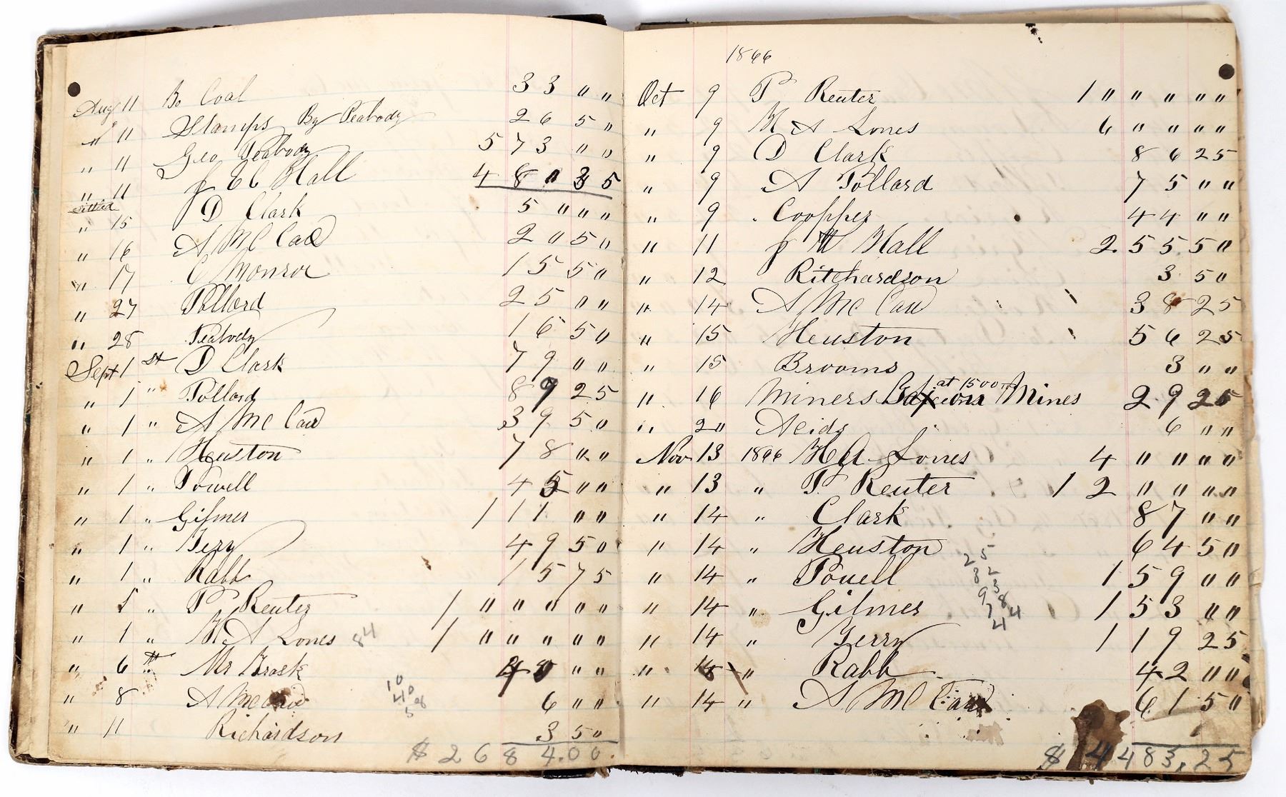 Ledger of Peabody and Hall from Brush Creek, Nevada County, California. Contains a list of names of people or other businesses that paid or received money from Peabody and Hall. It is unclear what kind of business Peabody and Hall had based on the contents of this ledger. 6.25 x 7.5 inches. Fair condition. Nevada County California