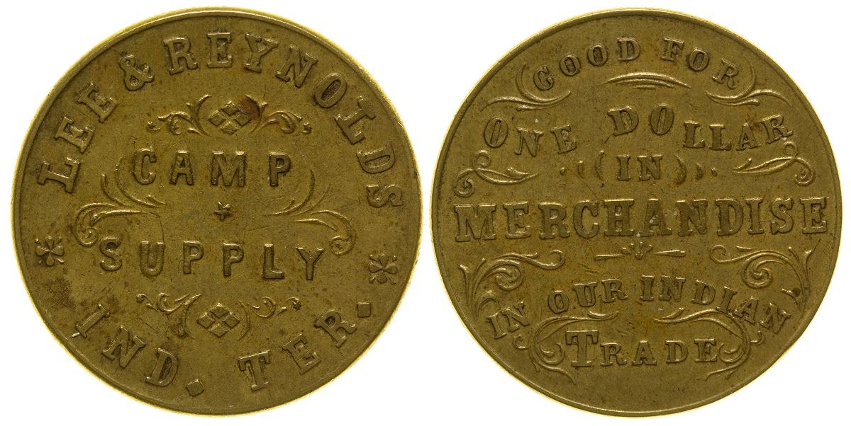 Obv.: Lee & Reynolds / Camp / Supply / Ind. Ter.; Rev.: Good For / One Dollar / in / Merchandise / in our Indian / Trade. Rd., Br., 25mm. City: State: Indian Territory Date: ID# 45202