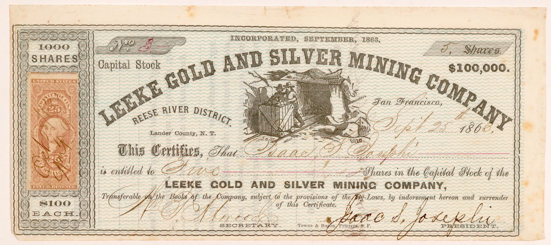 Reese River District, Lander County, N.T. (printed to the left of vignette). Inc. Sept. 1863. Low stock number three, issued to the company president Isaac S. Josephi on Sept. 25th, 1863 in San Francisco. Signed by president Josephi and secretary Wm. Atwood. Not cancelled. Black border and print, blue green background. Vignette of miners pushing ore cart out of mine by Boyd. Printed by Towne & Bacon, S.F. 25 cent adhesive US IR stamp at left. Pinholes, folds, some foxing, wear to edges. 4 x 9" No articles found on CDNC. Company is listed in the 1864 Langley with an office at 224 Montgomery. Josephi is listed as an importer and jobber. Ken Prag Collection