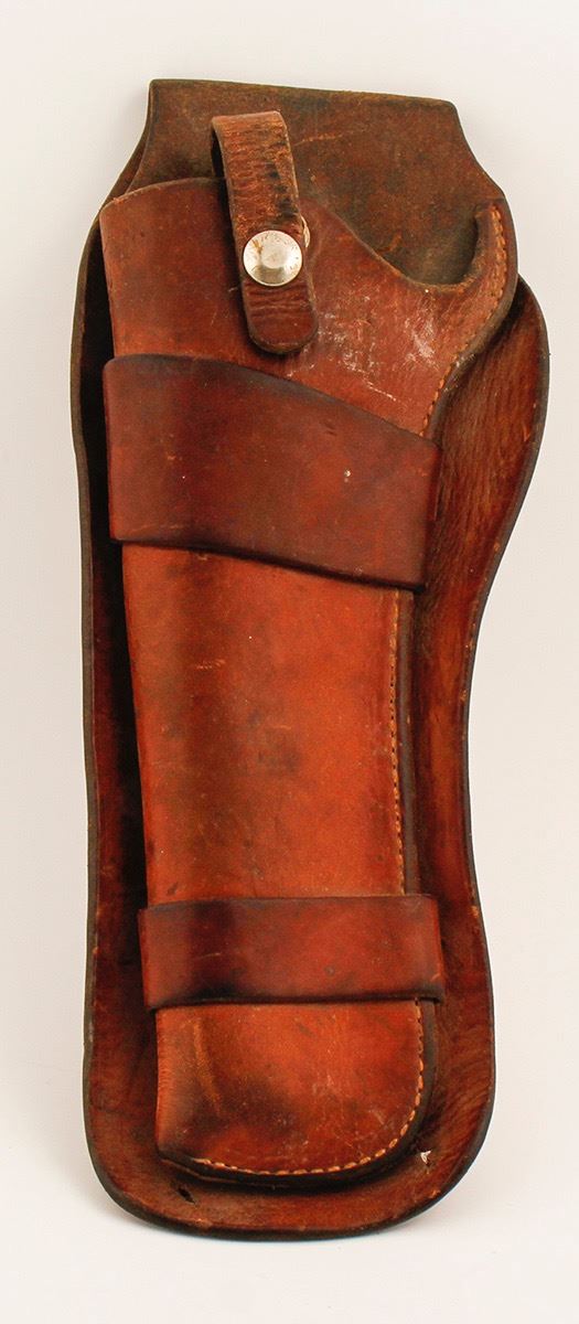 This holster is left handed with two Mexican loops in a saddle tan colored leather. It was built for a Colt single action or similar large framed gun with a 7 1/2 in. barrel. It is stamped "Sportsman's Store San Louis Obispo 97" on the back. The leather is aged and supple. Date: Location: HWAC# 42767