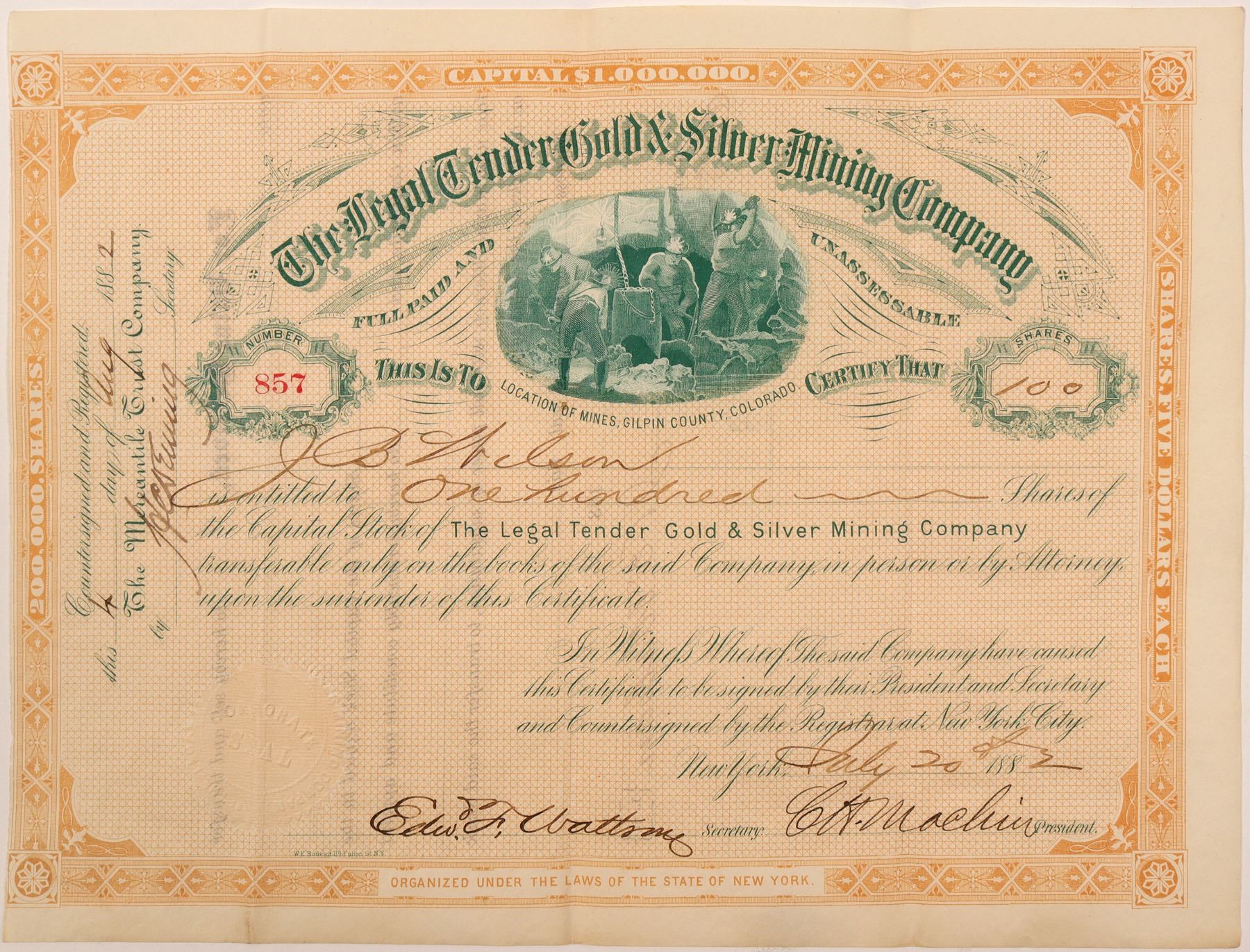 100 shares @ $5 each of Legal Tender Gold & Silver Mining Co. cert #857 issued on July 20, 1882. Signed by secretary and president. Mine is located in Gilpin County, CO. District: Bonanza (Kerber Creek). Countersigned and registered on Aug 4, 1882. Raised company seal and beige border. Folds on certificate. Organized under the laws of State of New York. Vignette of workers in mine. Printed: W. E. Badeau, 119 Fulton St. N.Y. Assigned.