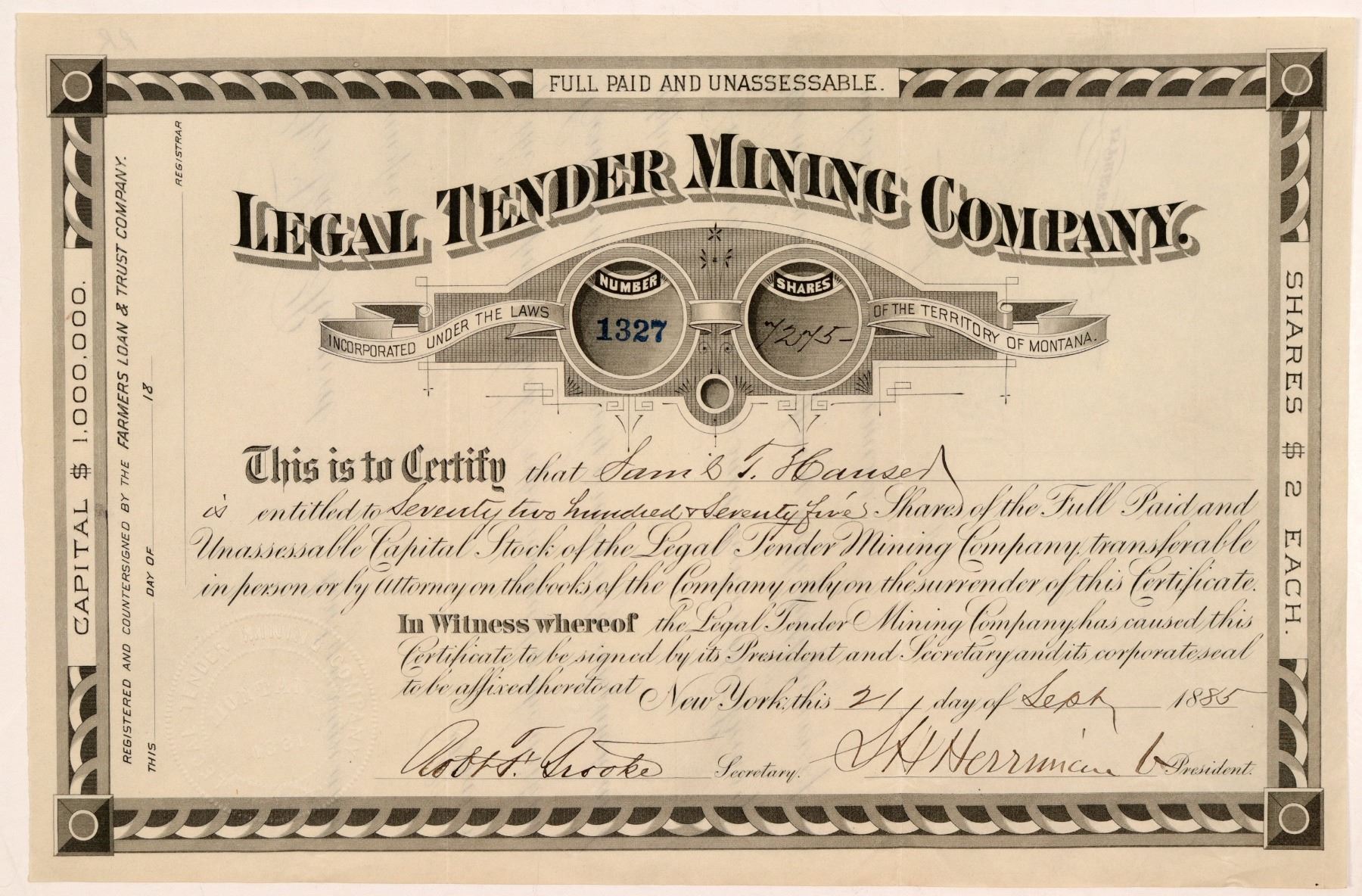 I/U #1327 Sam Hauser 7245 shares 1885. Signed by President Herrmann City: State: Montana Date: 1885