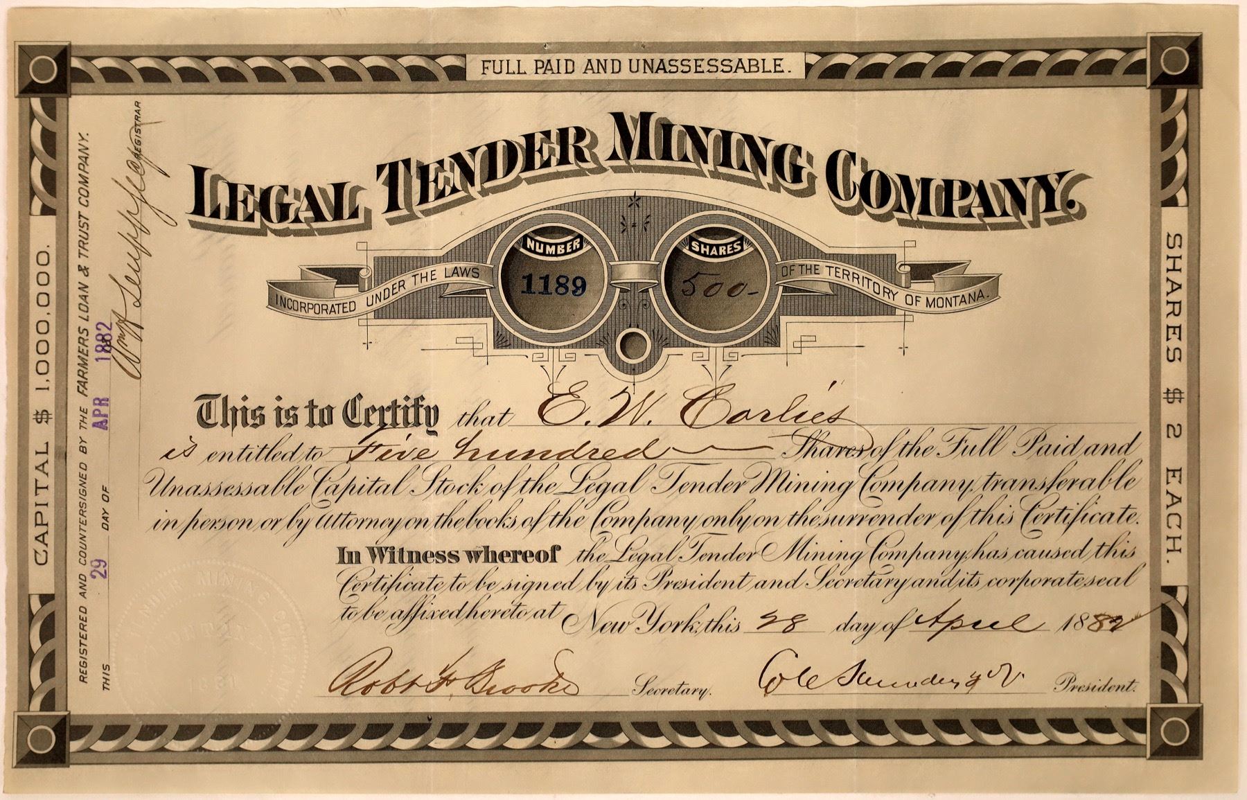 Inc. in Montana Territory. No. 1189, issued for 500 shares to EW Carlies in 1882. Signed by vice president Cole Sanders and the secretary. Not cancelled. Ornate border, black print. Pinholes, folds, very fine. 6.75 x 10.5" The Legal Tender Mine is "one of the most famous mines of Montana, and has produced the richest ore ever shipped in quantity from the Territory." In 1881, this company was reopening the mine, which had been worked in the 1870s. Their plan was to erect hoisting machinery to sink a 750 ft. shaft on the property, as well as build a mill facility that would consist of two Huntington mills. In Nov. 1881, the company discovered a rich six-inch vein of ruby silver and silver glance ore, and deposited the specimens at the First National Bank in Helena. [The Independent Record, May 27, 1881 and Nov. 18, 1881]