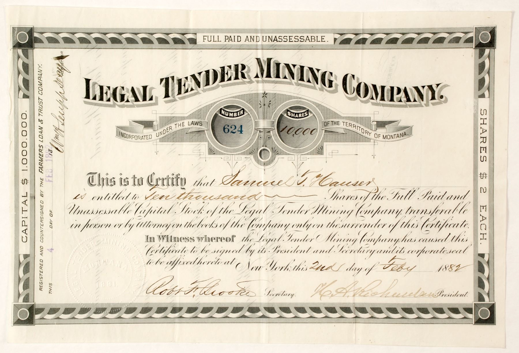 Issued under the laws of the Territory of Montana, a stock certificate for 10000 shares of Legal Tender Mining Company. 10 1/4 x 7 inches. State: Montana City: Date: 1882 Al Adams Collection. HWAC# 58161