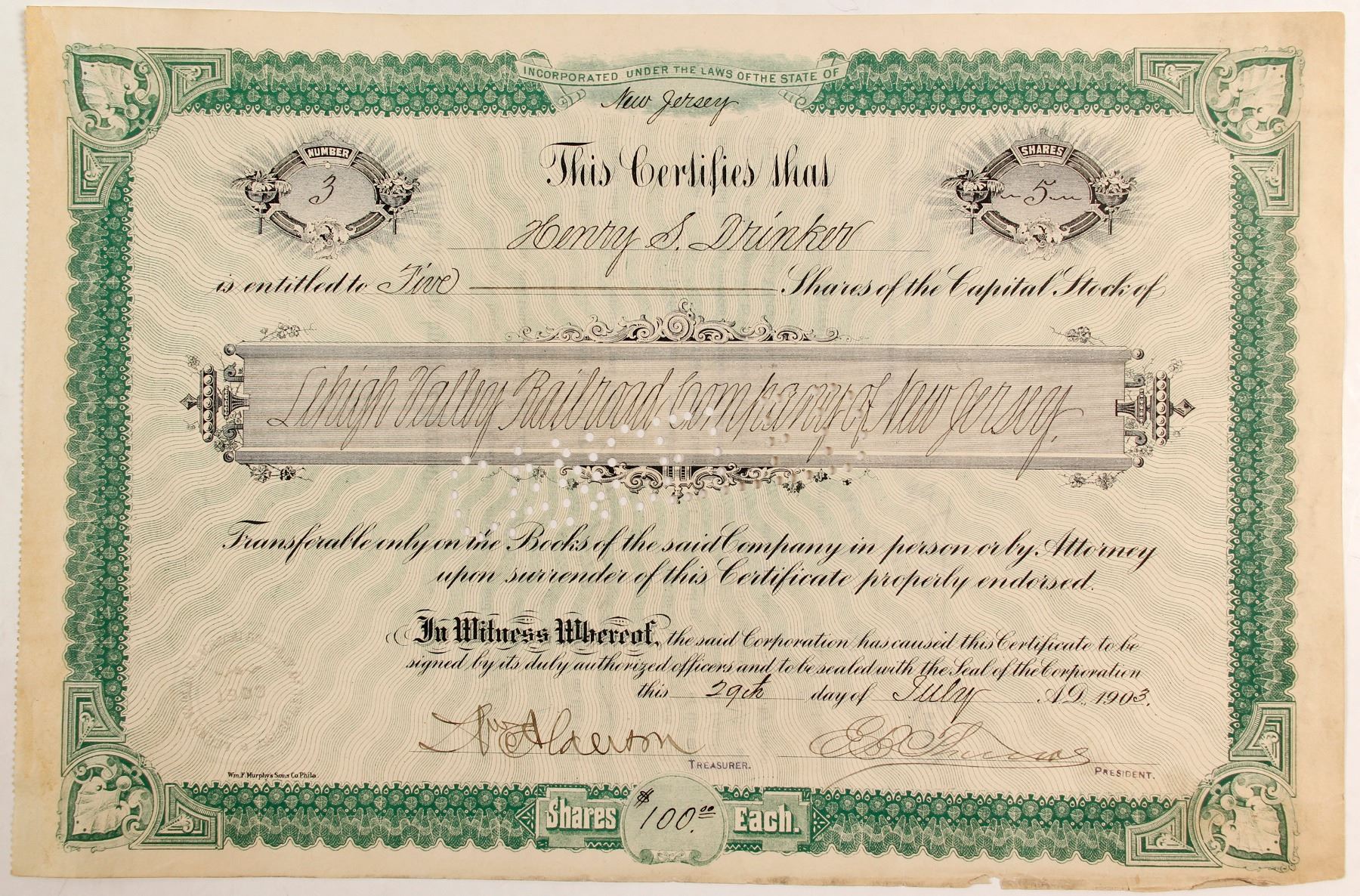 I/C #3 Henry Drinker 5 shares 1903 signed by President Thomas. Tattered bottom. Ken Prag Collection