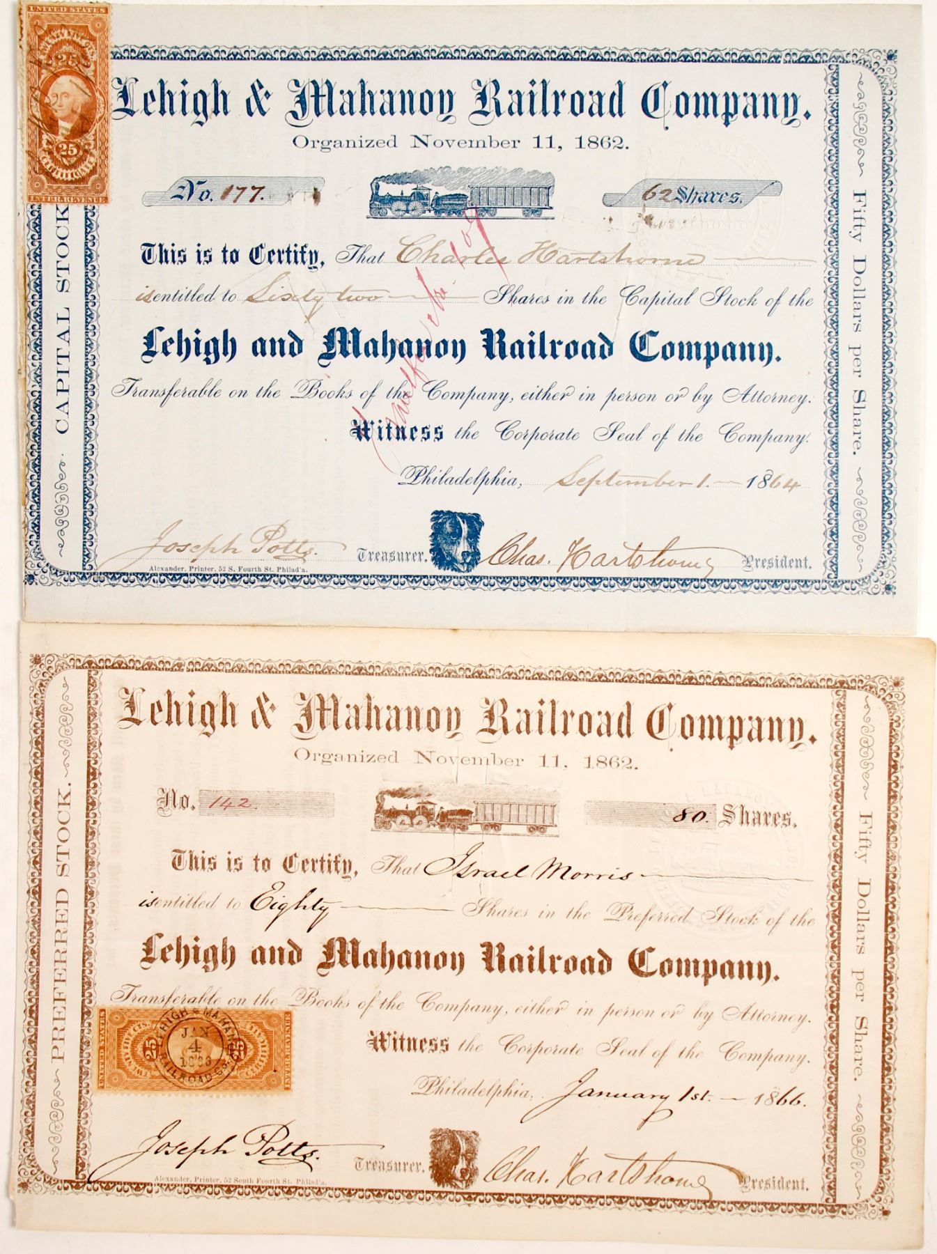 Unlisted I/C blue #177 Charles Harts?? 62 shares 1864 signed by President Harts??? 25c revenue stamp. Brown I/C #142 Israel Morris 80 shares 1866 signed by President Harts? 25c revenue stamp. Small train vignette. Prag Collection State: City: Date: 1864-1866 HWAC# 85129