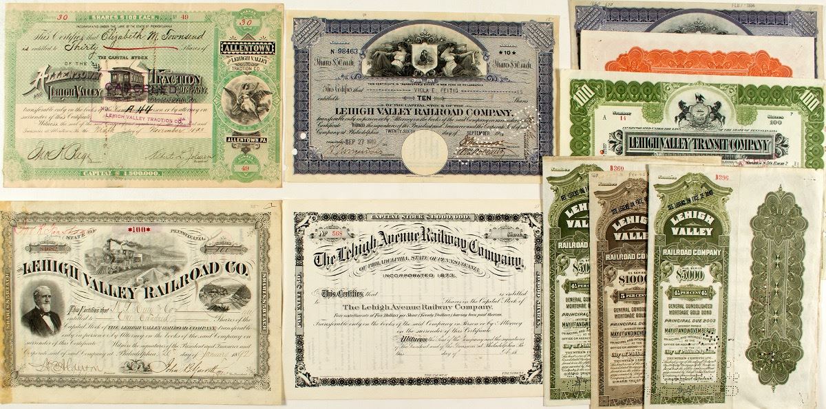 Lot of eleven from four different Lehigh rails. 1) Lehigh Valley Railroad Company: early pictorial stock (1892, punched), and two later stocks (1919, 1933, both punched). Also, five bonds, four different: $1,000 (1935, punched), $5,000 (3, two different, 1945-46, all punched), and $10,000 (1944, punched). 2) Other rails: Allentown & Lehigh Valley Traction Co. (1893, stamp cancelled stock), Lehigh Valley Transit Co. (1913, punch cancelled stock), and unissued stock for The Lehigh Avenue Railway Company. (Prag Collection) City: Lehigh State: Pennsylvania Date: 1892-1946 hwac# 34567