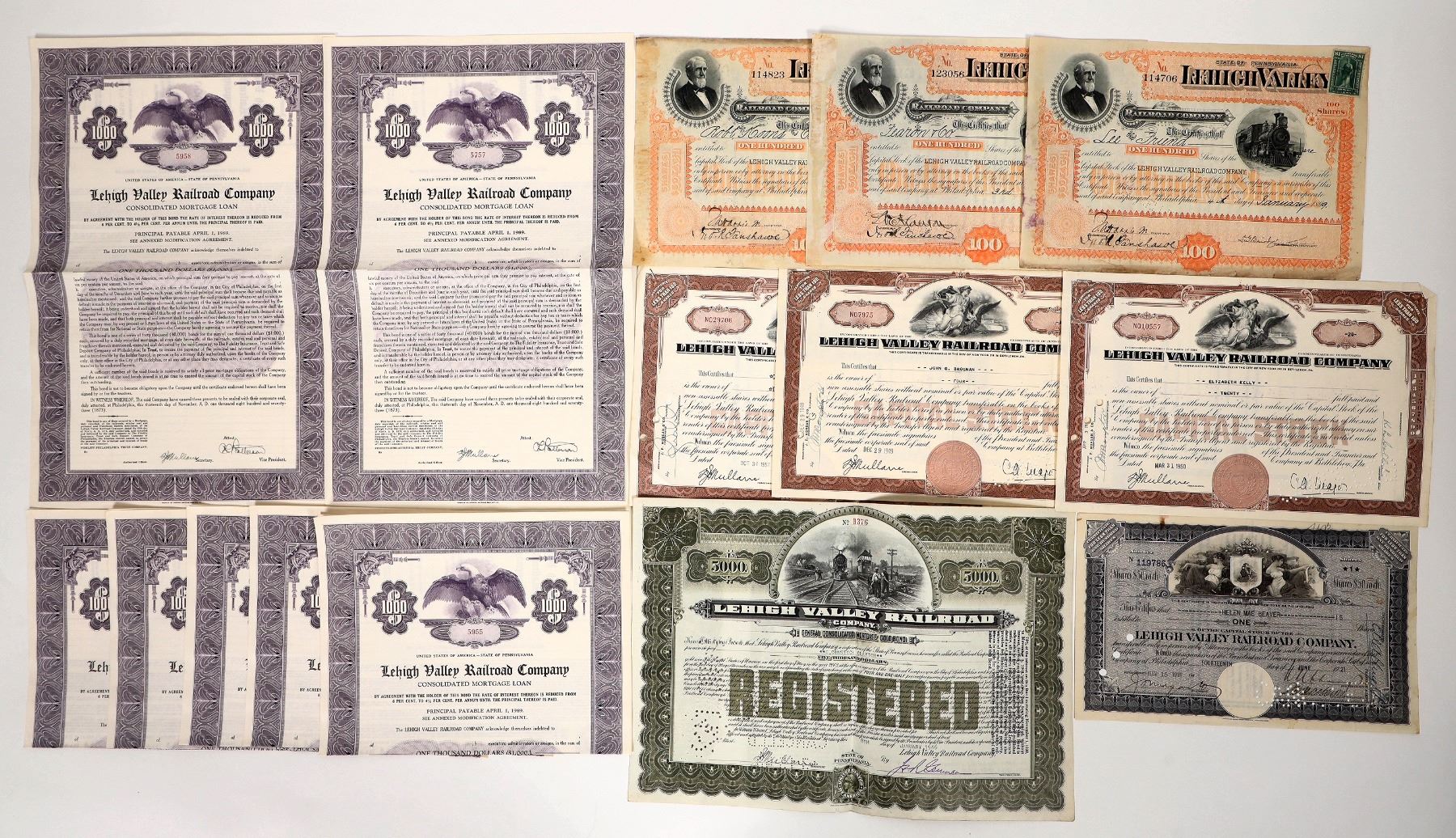 8x bonds, 7x stocks, 1873-1950. The 2 orange 1899 stocks are fair condition.