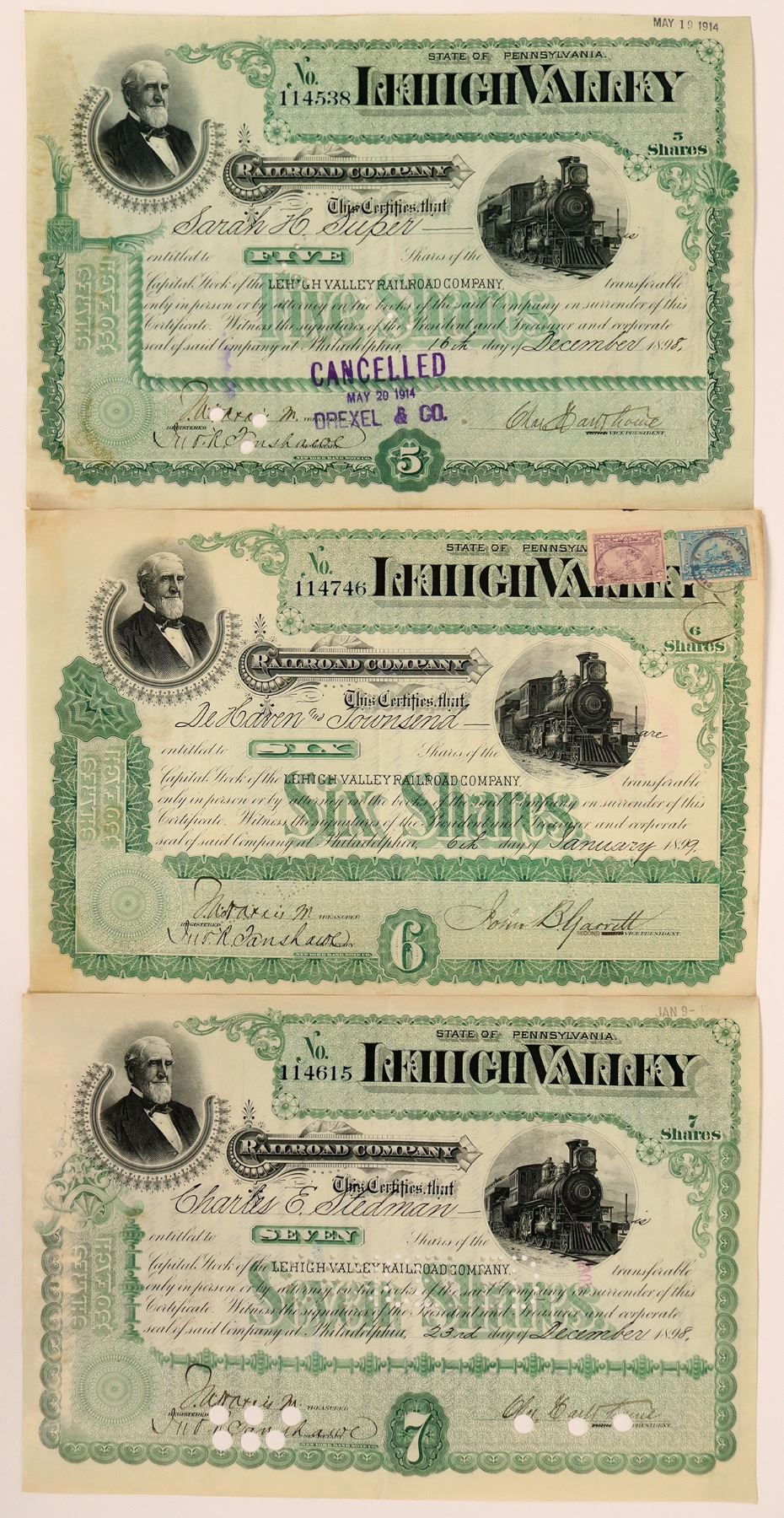 3 certificates. The Lehigh Valley Railroad was one of a number of railroads built in the northeastern United States primarily to haul anthracite coal. Then was authorized on April 21, 1846, for freight and transportation of passengers, goods, wares, merchandise and minerals and the railroad was incorporated/established on September 20, 1847, as the Delaware, Lehigh, Schuylkill and Susquehanna Railroad Company. On January 7, 1853, the railroad's name was changed to Lehigh Valley Railroad. It was sometimes known as the Route of the Black Diamond, named after the anthracite it transported. At the time, anthracite was transported by boat down the Lehigh River; the railroad was meant to be faster transportation. The railroad ended operations in 1976 and merged into Conrail along with several northeastern railroads that same year.