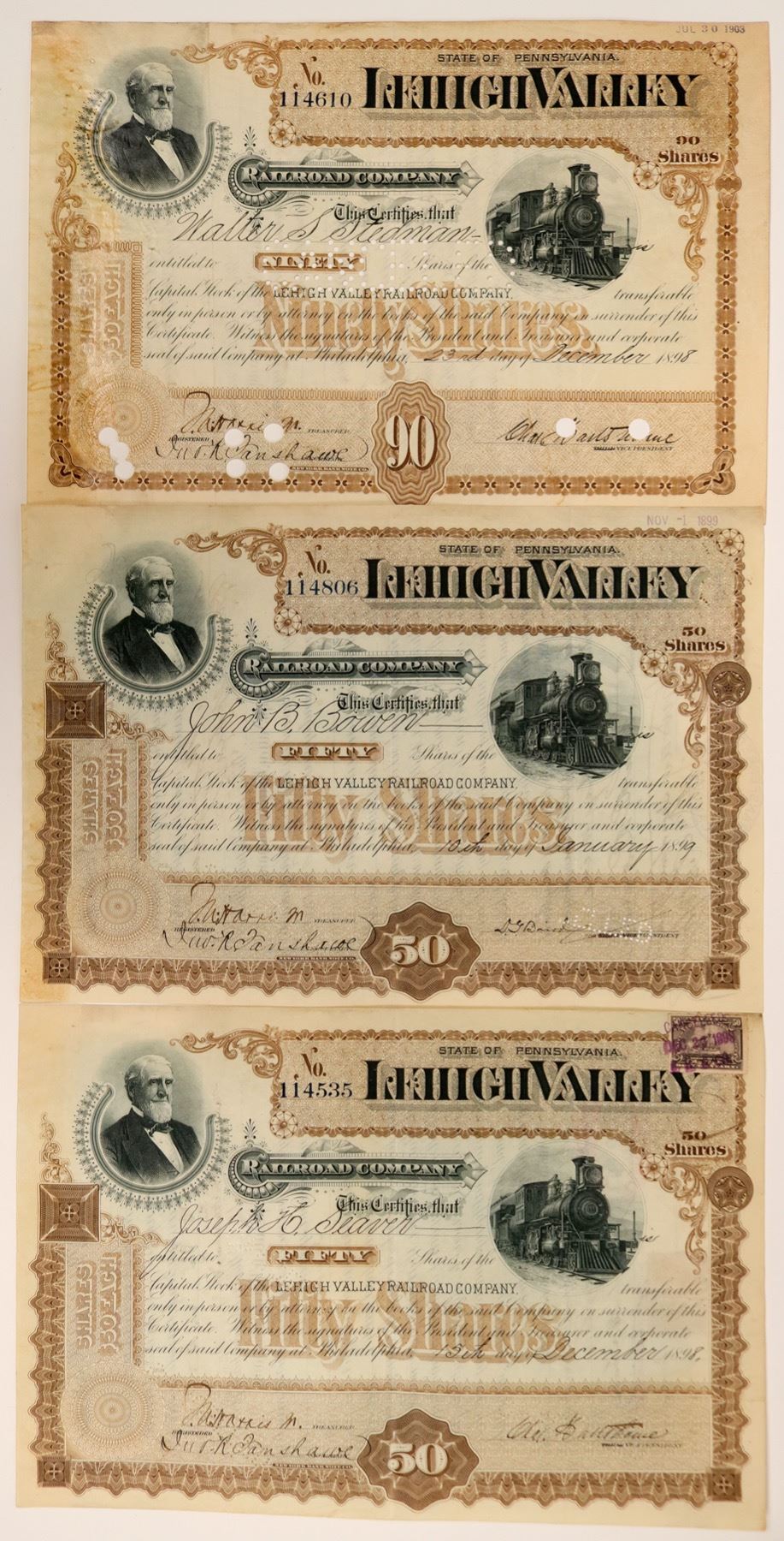 3 Certificates are I/C. 50 and 90 shares @ $50 par, issued 1898-99, signed Charles Hawthorne President, Brown, embossed seal, underprint of share number. Vignettes : left top Asa Packer 4-8-2 #444 train circle on right, one w/revenue stamps. New York Bank Note Co. VF