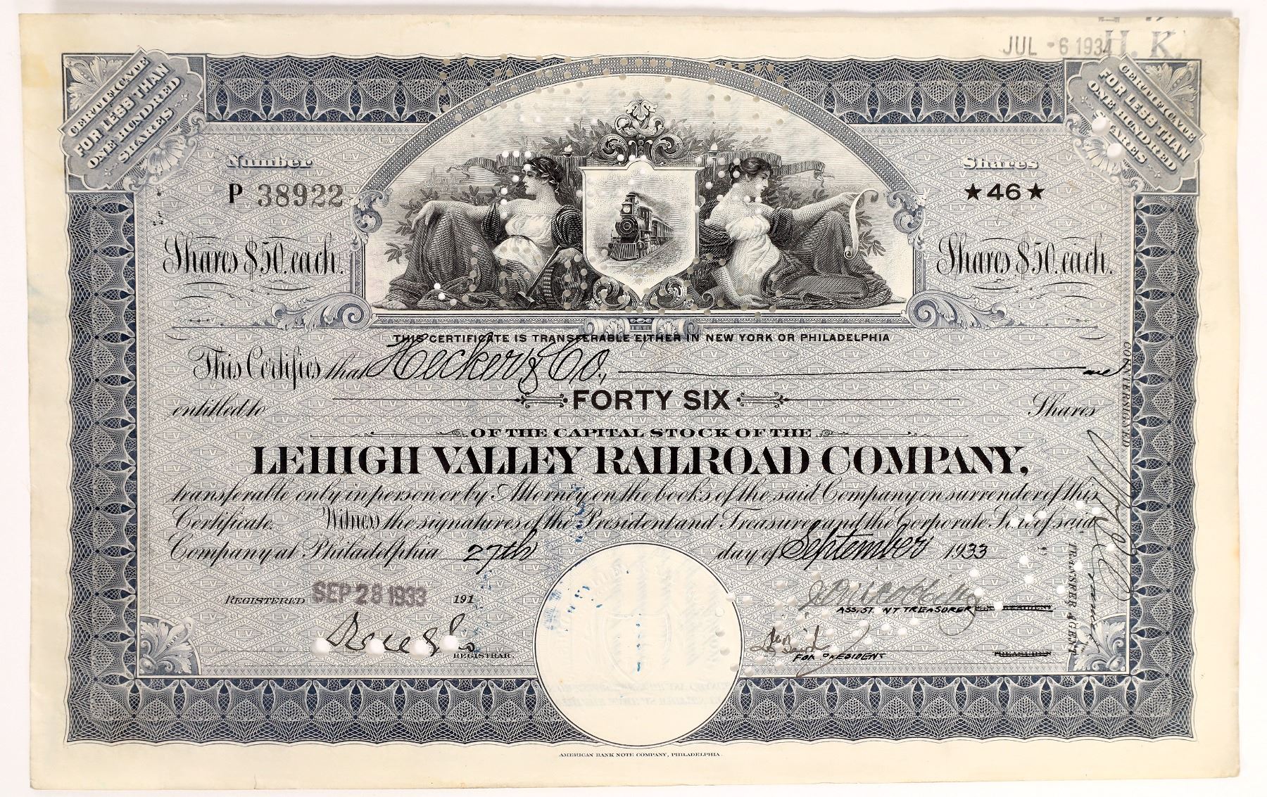 Lehigh Valley Railroad Co., Stock, Incorp Penn., 46 shares, #P38922, issued to Hecker & Co, 1933, signed by president and asst. treasurer (illegible), 11x7", i/c