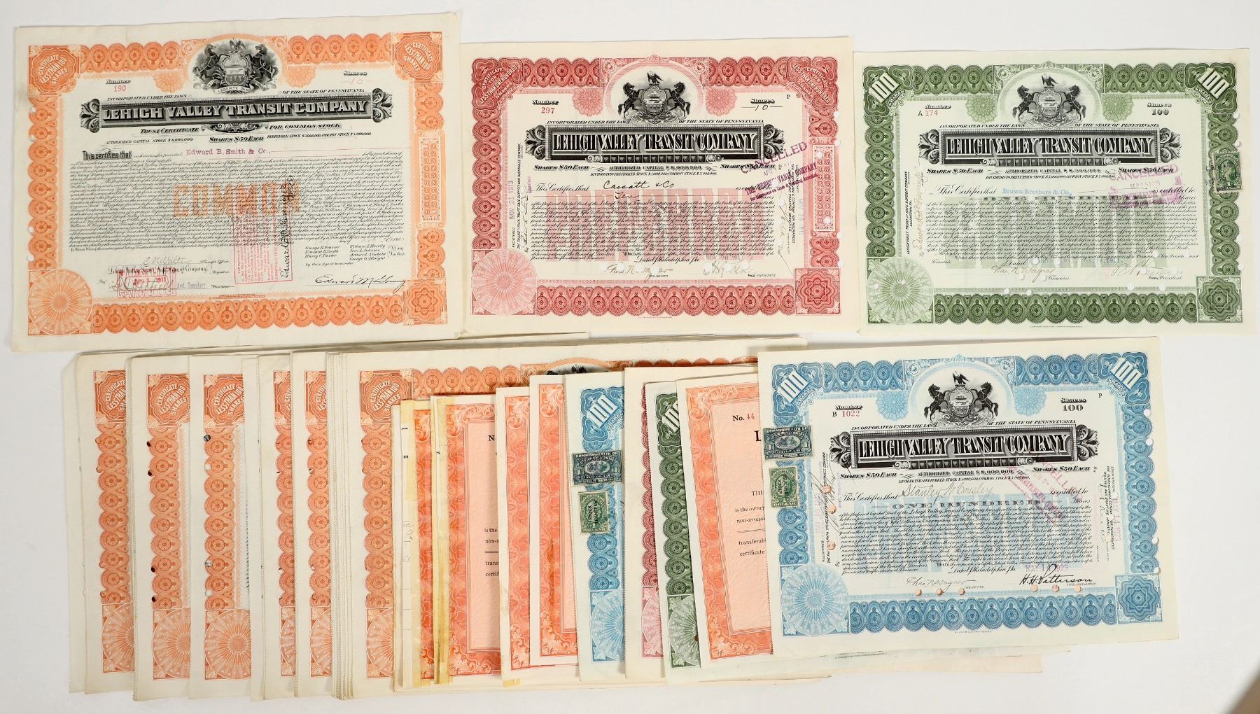 There are over 50 stock certificates for the Lehigh Valley Transit Co. issued between 1910-1967. Nine are preferred stocks. Please see photo for details.