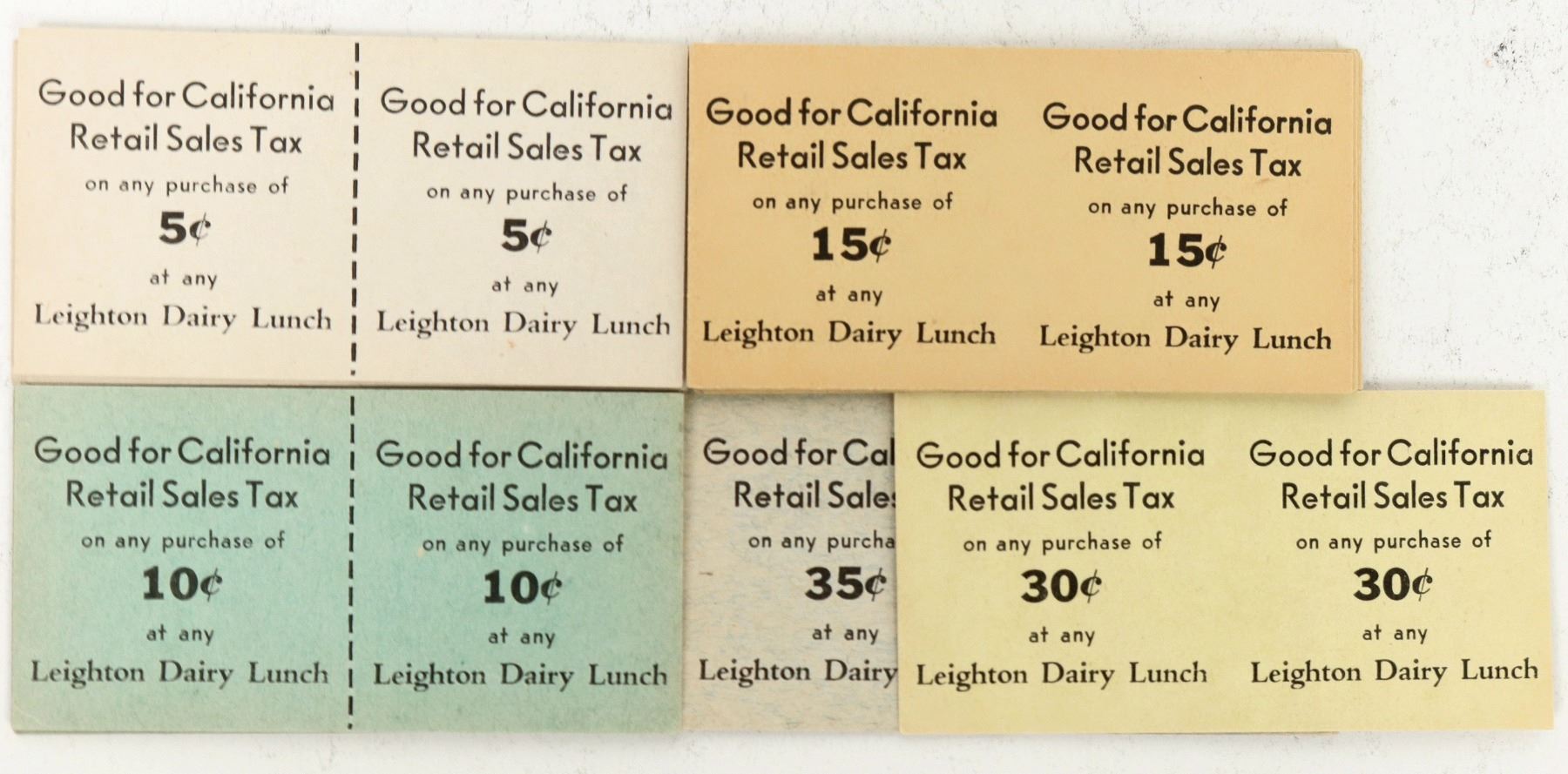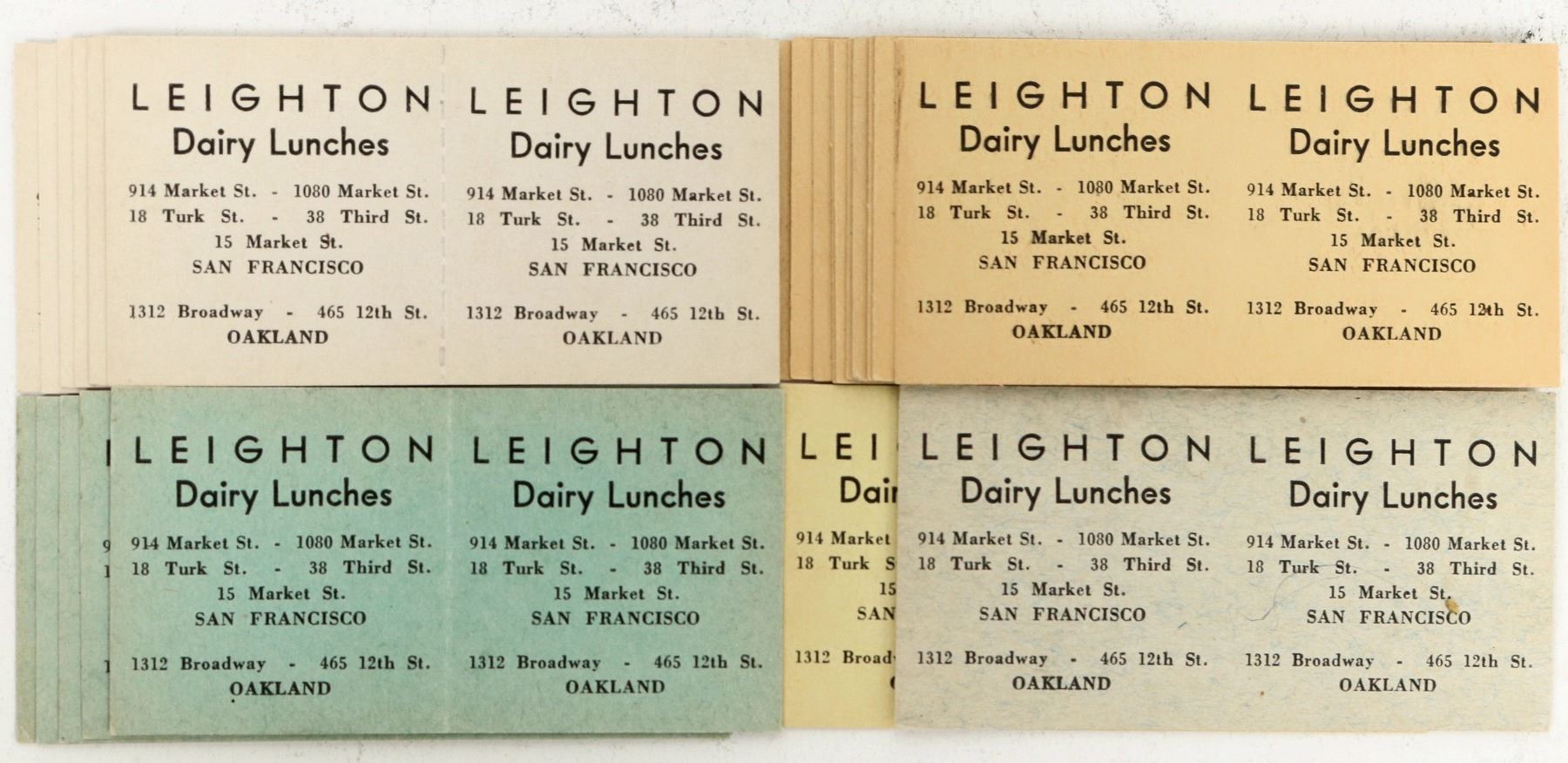 Coupons good for California Retail Sales Tax at any Leighton Dairy Lunch locations: 914 Market St., 1000 Market St., 18 Turk St., 38 Third St., 15 Market St. in San Francisco and 1112 Broadway and 465 12th St., in Oakland. Paper coupons are 3 x 1 inch; Good for 5 cent (6); 10 cent (5); 15 cent (10); 30 cents & 35 cents. John H. Leighton came to San Francisco in 1916 and by 1927 was head of capital industries representing $1,500,000.