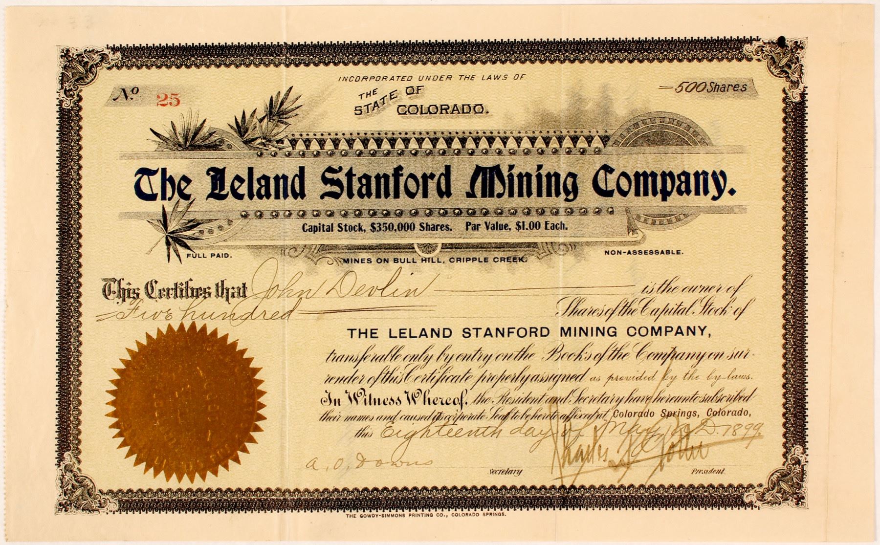 Location printed on certificate: Mines on Bull Hill, Cripple Creek. Inc. May 1899. No. 25, issued to John Devlin for 500 shares on May 18th, 1899 in Colorado Springs. Signed by Charles F. Potter, president, and A.O. Downs, secretary. Not cancelled. Ornate logo and border. No vignette. Folds. 7 x 11" Owned the Leland Stanford, California, Ellis, and Whistler claims. [Ref: Cripple Creek Manual, 1900] State: Colorado City: Cripple Creek Al Adams Collection. HWAC# 58401