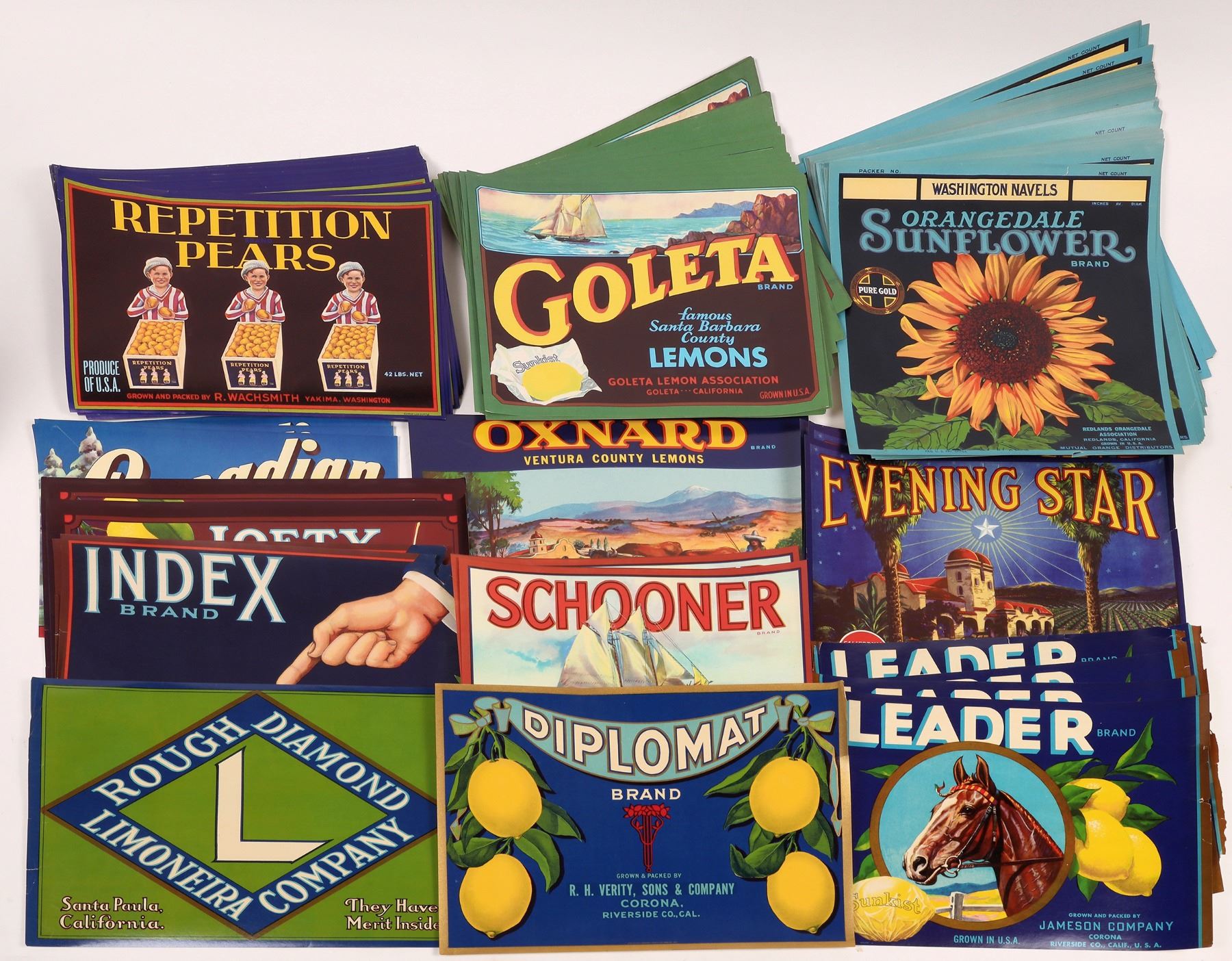 About 400 lemon, orange and pear crate labels, 7.5x11". Repetition Pears, Cascadian Pears, Goleta, Orangedale Sunflower and more.