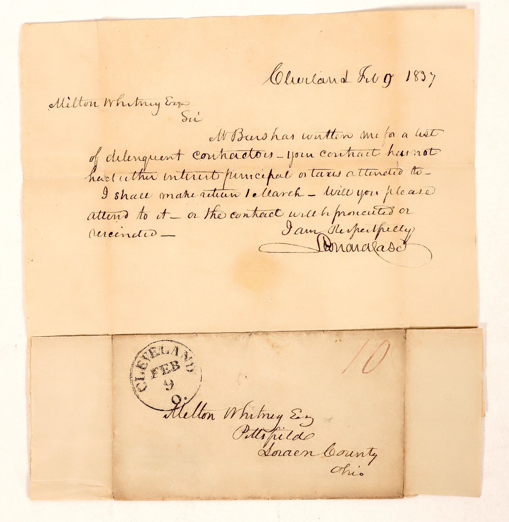 An 1837 signed letter from Leonard Case, founder of the Case School of Applied Science. This school would evolve into the Case Institute of Technology and later merge with the Western Reserve University to form Case Western Reserve University, a private research university in Cleveland, Ohio. The letter discusses a dispute regarding "delinquent contractors". [ Cleveland Ohio