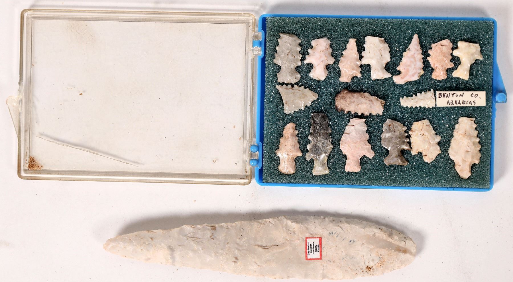 This group has a spectacular lanceolate at 5 in./ 127 mm from Chautauqua County, Kansas. This specific piece is bevel edged on the left side only, on both sides and thought to be a Lerma Round Base spear point. This type of point has been previously found in Texas, Tenn., Kentucky; but only left edge bevels have been (previously) found in Alabama and Tennessee. Our lot also includes very specific serrated edge bird points. All are partials and less than an inch in length, but quite unique from Benton County, Arkansas. From the Bracken collection. Please see photos for details. (ref. Indian Arrowheads, Overstreet and Peake, 1991, p. 457).