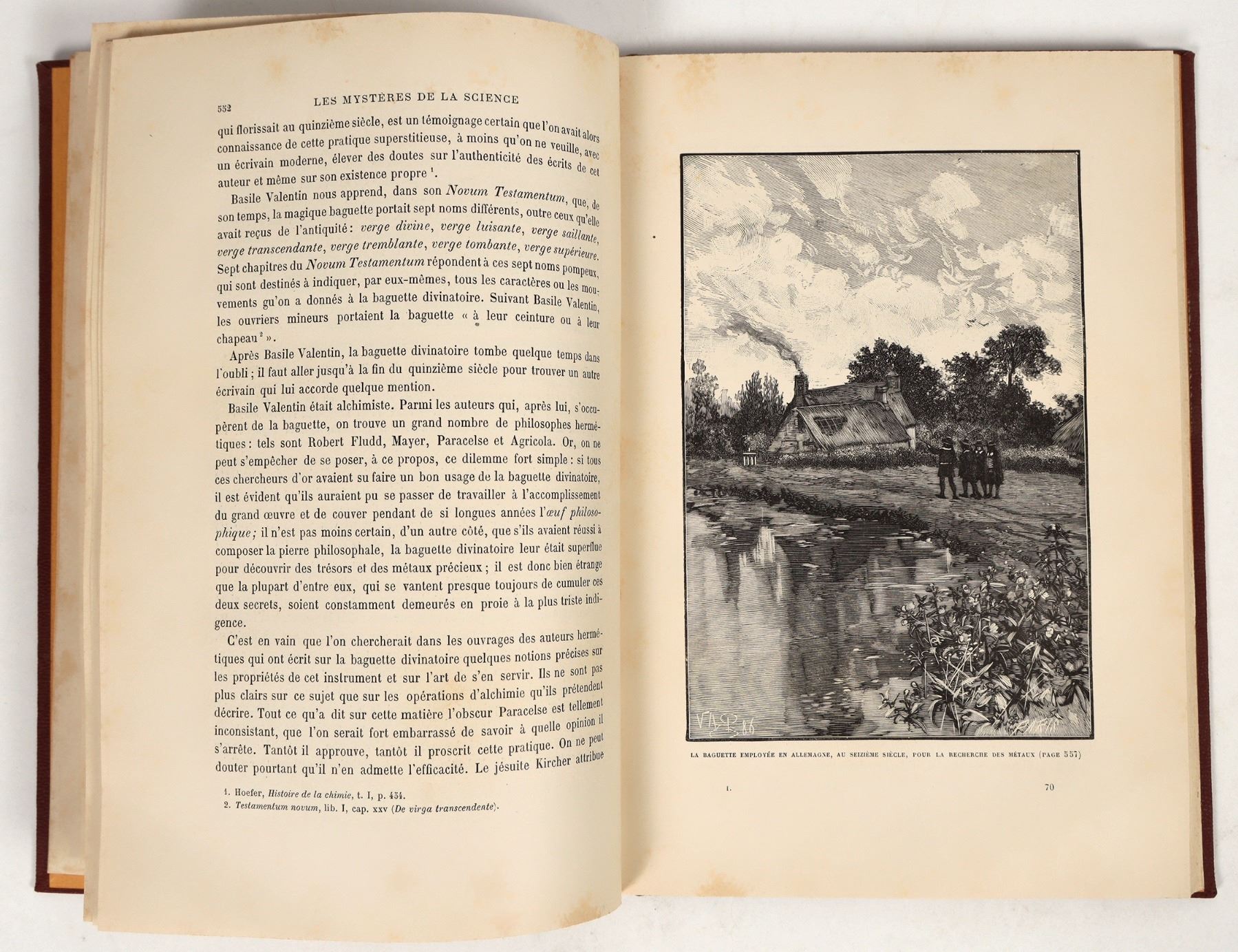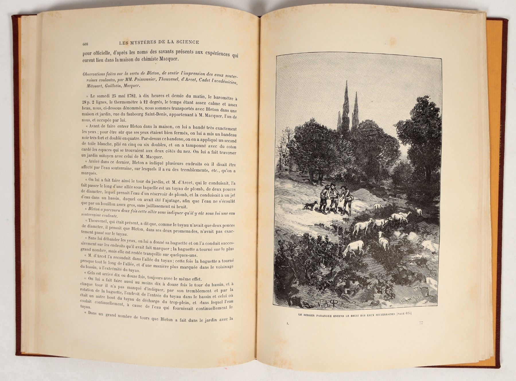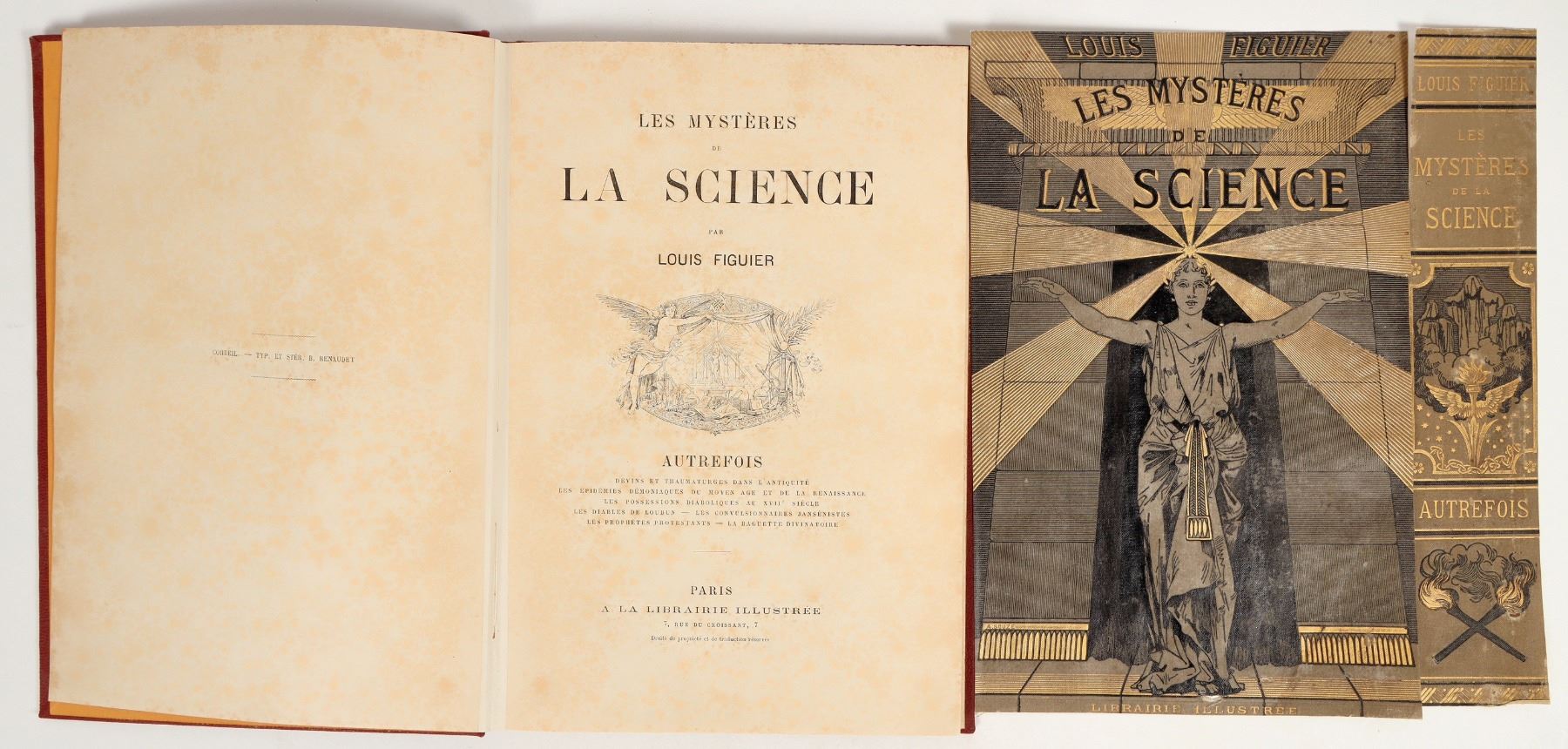 Louis Figuier was known for making science accessible to the general public through richly illustrated works. In Les Mysteres de la Science, he demystified phenomena once explained by demons, magic, or prophecy, and placed them within the framework of rational science. Essentially, the book documents the "mysteries" of past centuries as part of humanity's evolving understanding of the natural world. The topics explore how superstition, religion, and science intertwined in history: Diviners and thaumaturges in antiquity; Demonic epidemics of the Middle Ages and Renaissance; Diabolical possessions in the 17th century; The Devils of Loudun (famous mass possession case in France, 1630s); Jansenist convulsionaries (18th century mystical movement); Protestant prophets; and the divining rod (la baguette divinatoire). 647pp. Heavy foxing. Illustrated cover present, but detached. Likely rebound. No date, but this appears to be the 1887 edition.