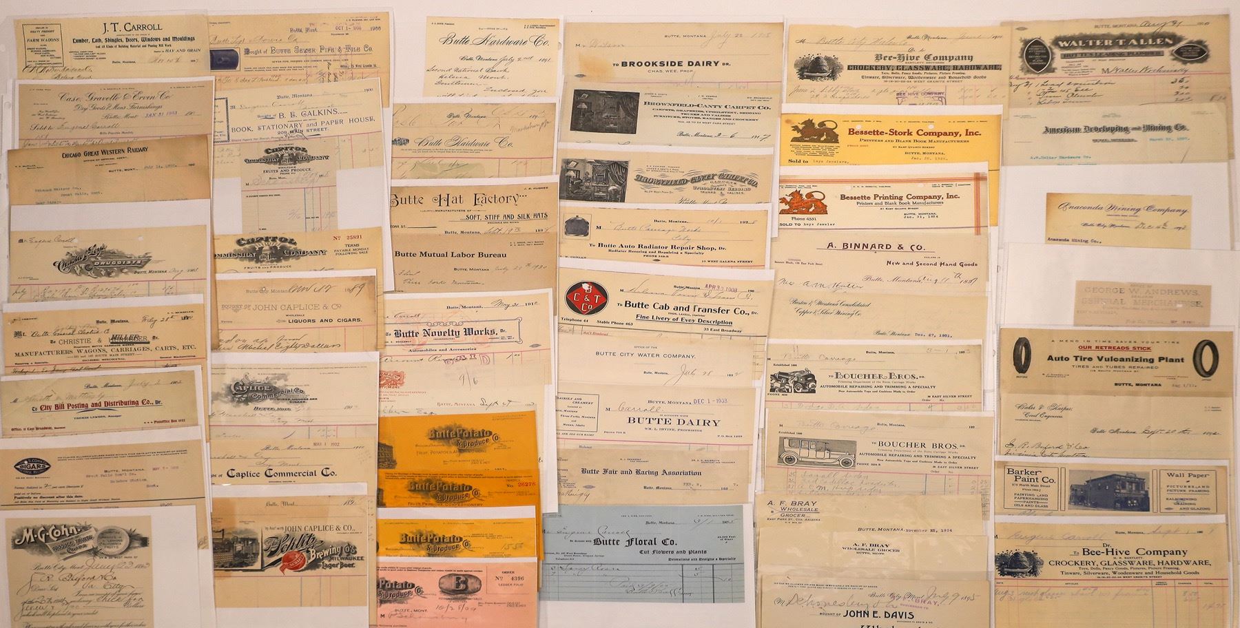 An impressive collection of approximately 200 letterheads and billheads from the Montana town of Butte from the late 1800's to the early 20th century. There are several retail as well as service company bills and receipts in this two binder group. Businesses include Walter T. Allen, plumber, Butte Hardware Company, Davis & Company Wholesale Grocers, Dempsey & Courter Horseshoeing a Specialty (Four shoes for $2.50), George M. Frakes, Scavenger and many, more. Fascinating look at the past. Please see photos for more detail and condition.