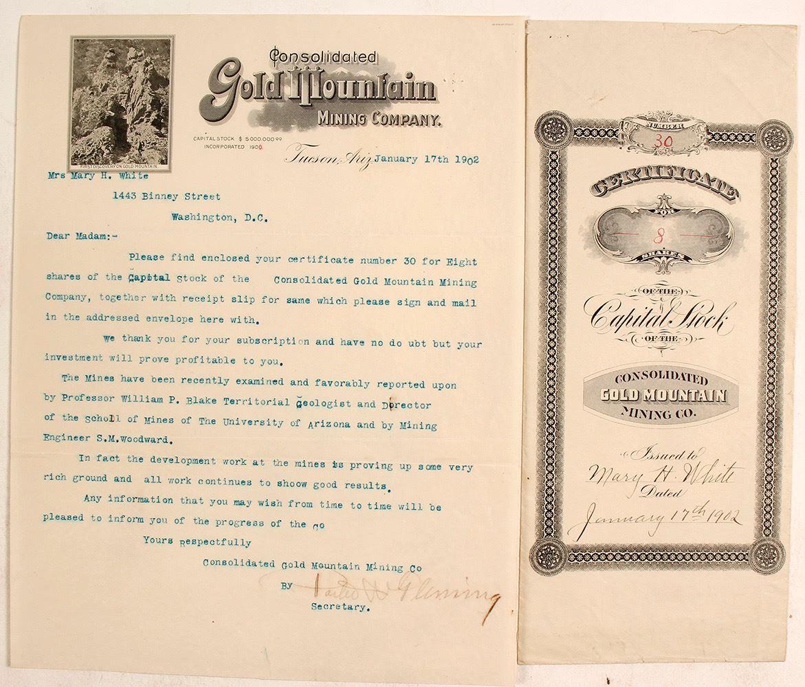 Letter from Mr. Flemming, Secretary from Consolidated Gold Mountain Mining Co. to Mrs. Mary H. White from 1902. The Cert. is No. 30, for 8 shares. Good condition. HWAC# 61269 Date: 1902 Location: Tucson, Arizona