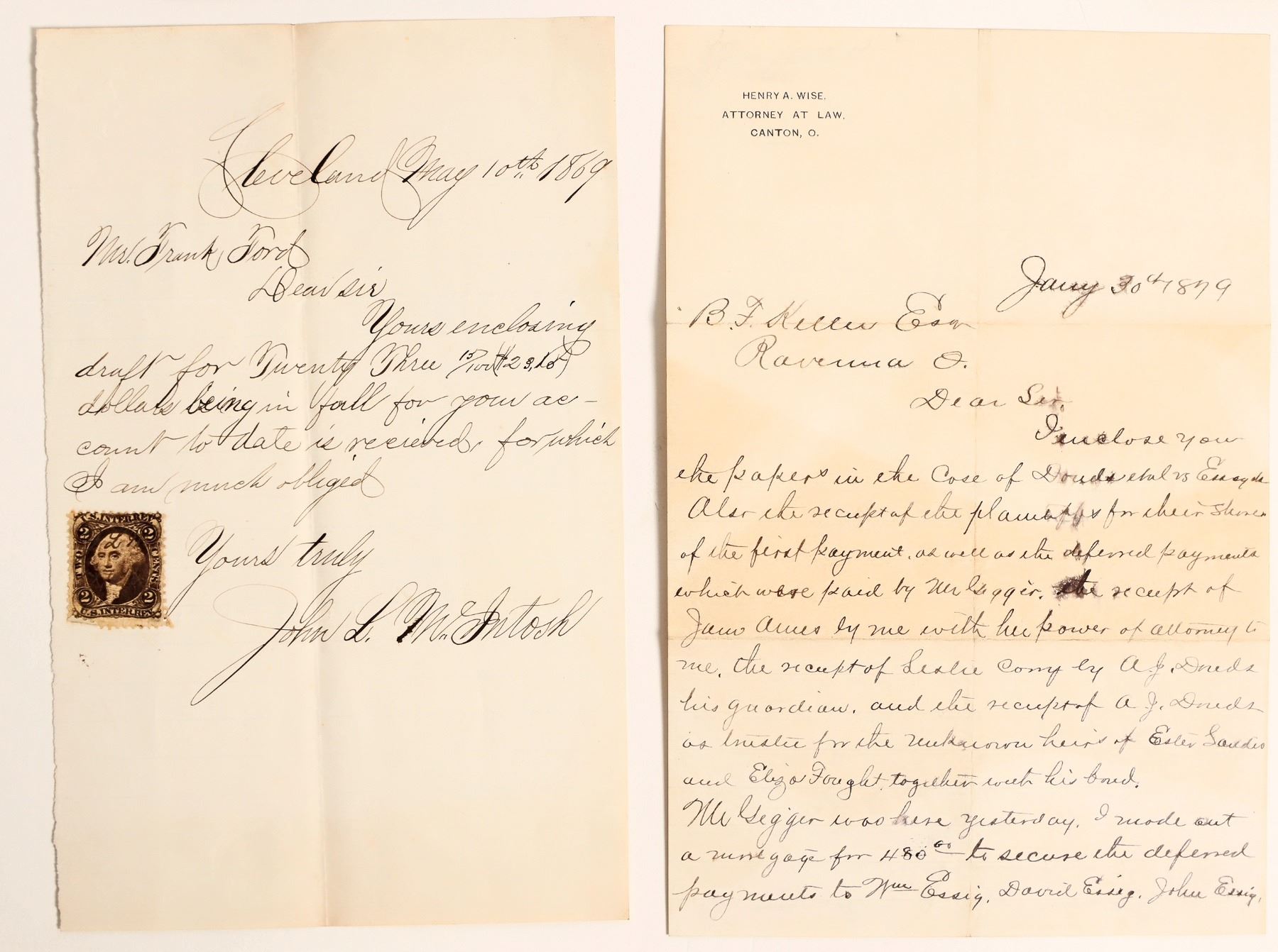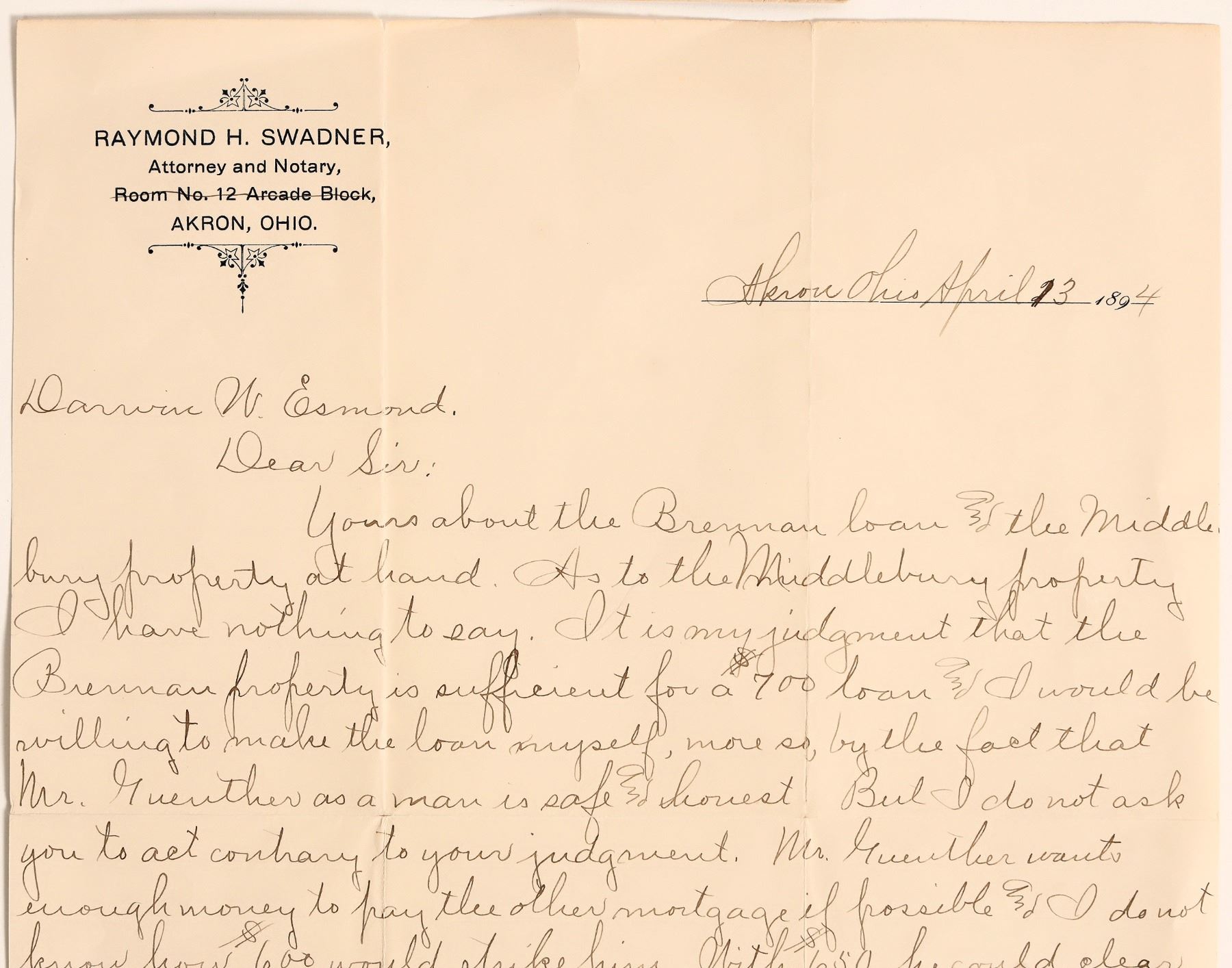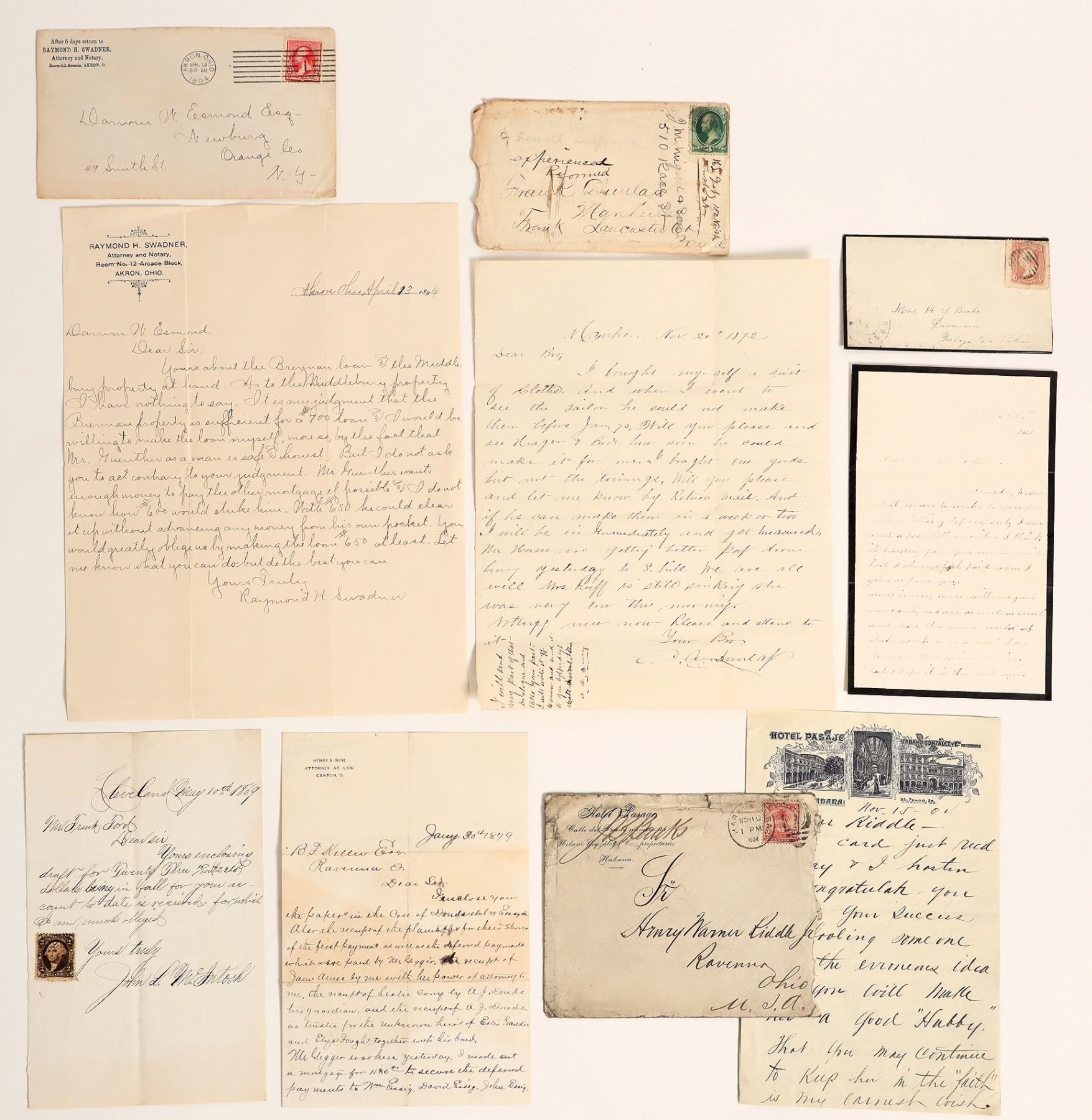 A collection of six letters, ranging in date from 1865 to 1904, sent to and from the people of Portage County, Ohio. These letters provide a glimpse into the lives and times of early Portage citizens, ranging in topic from the official (such as the purchase of land in and development of early Akron) to the personal (as one man writes to congratulate his friend on "fooling someone into the erroneous idea that [he] will make a good hubby.") [ Ravenna Ohio