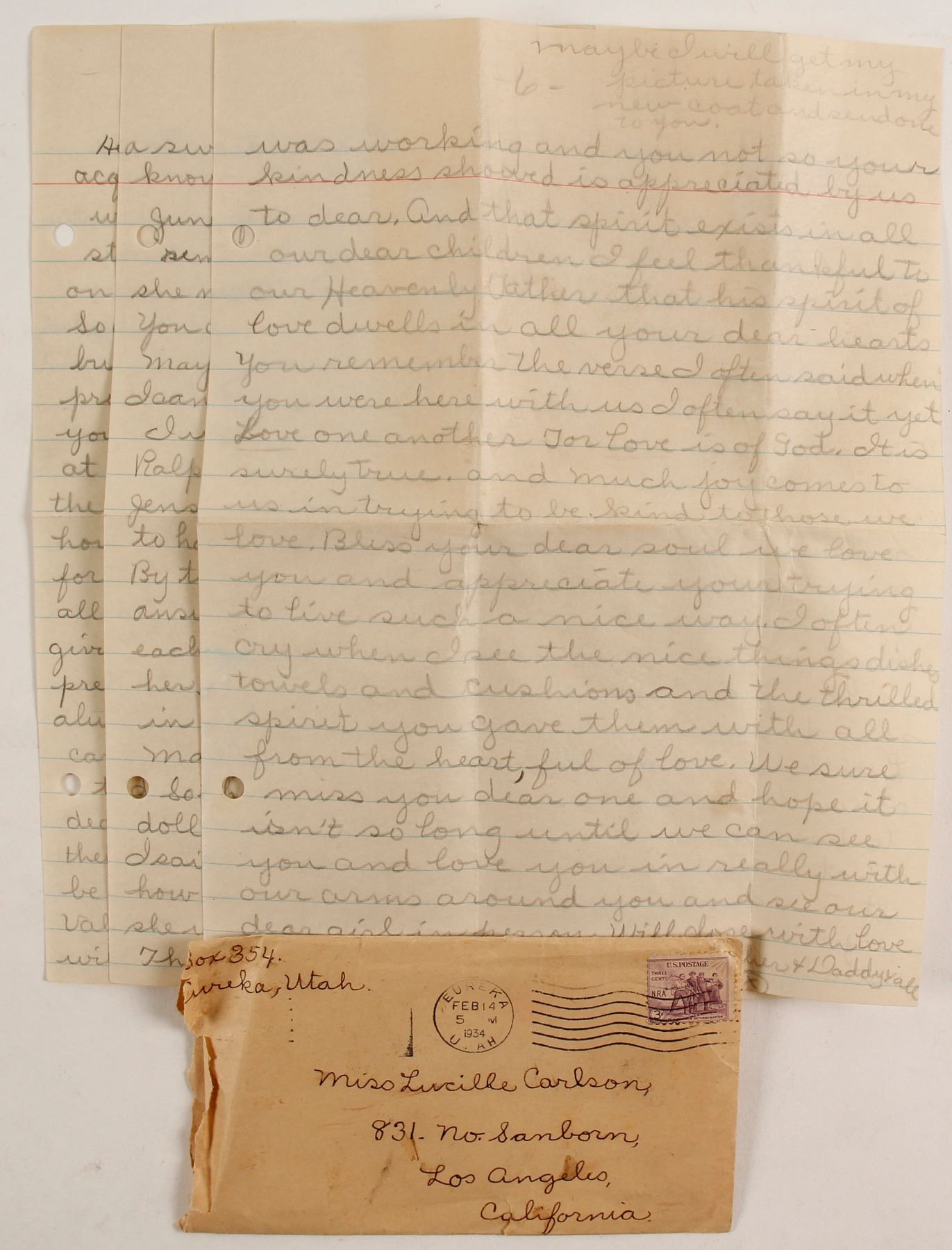 6 page letter written to Miss Lucille Carlson in Los Angeles, CA from her mother & father in Eureka Utah, dated February 14, 1934.