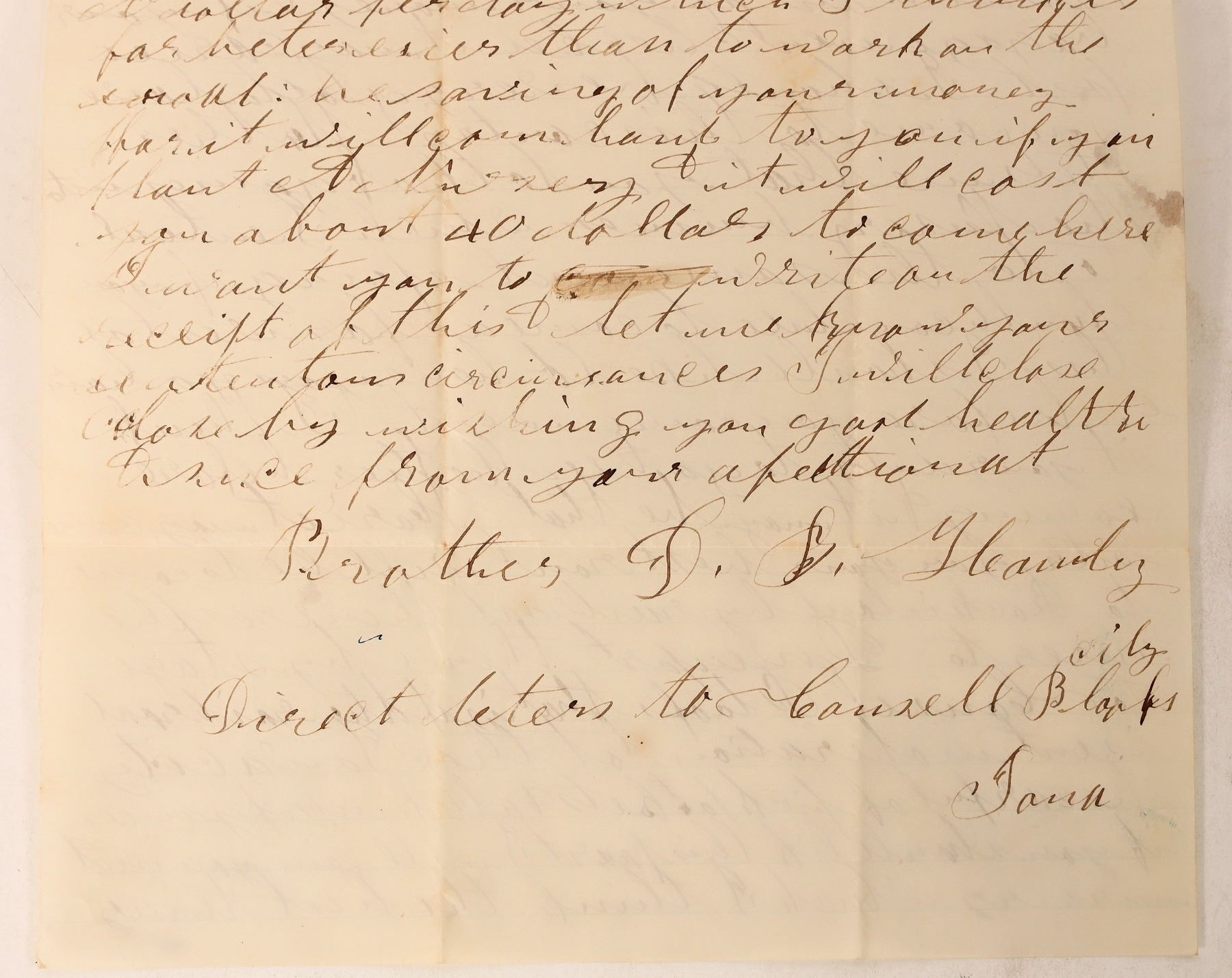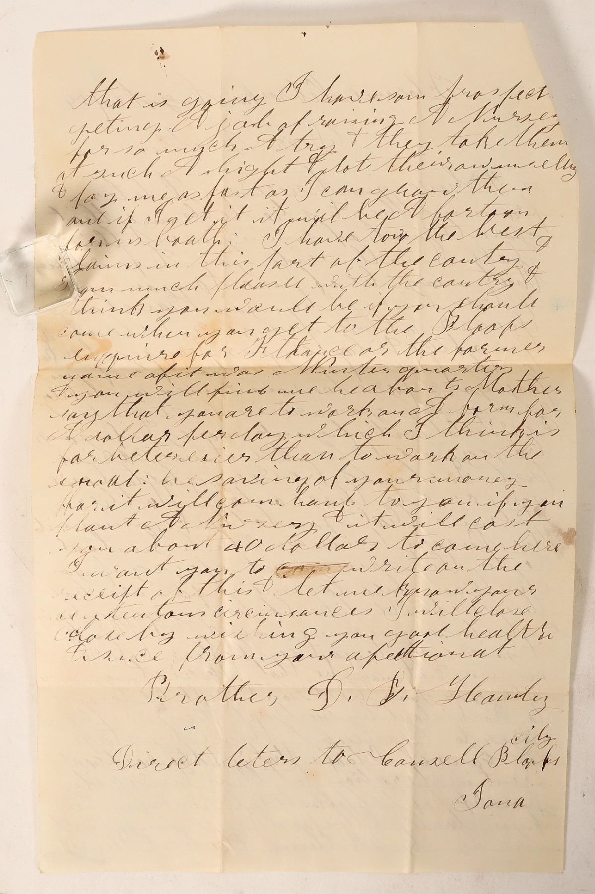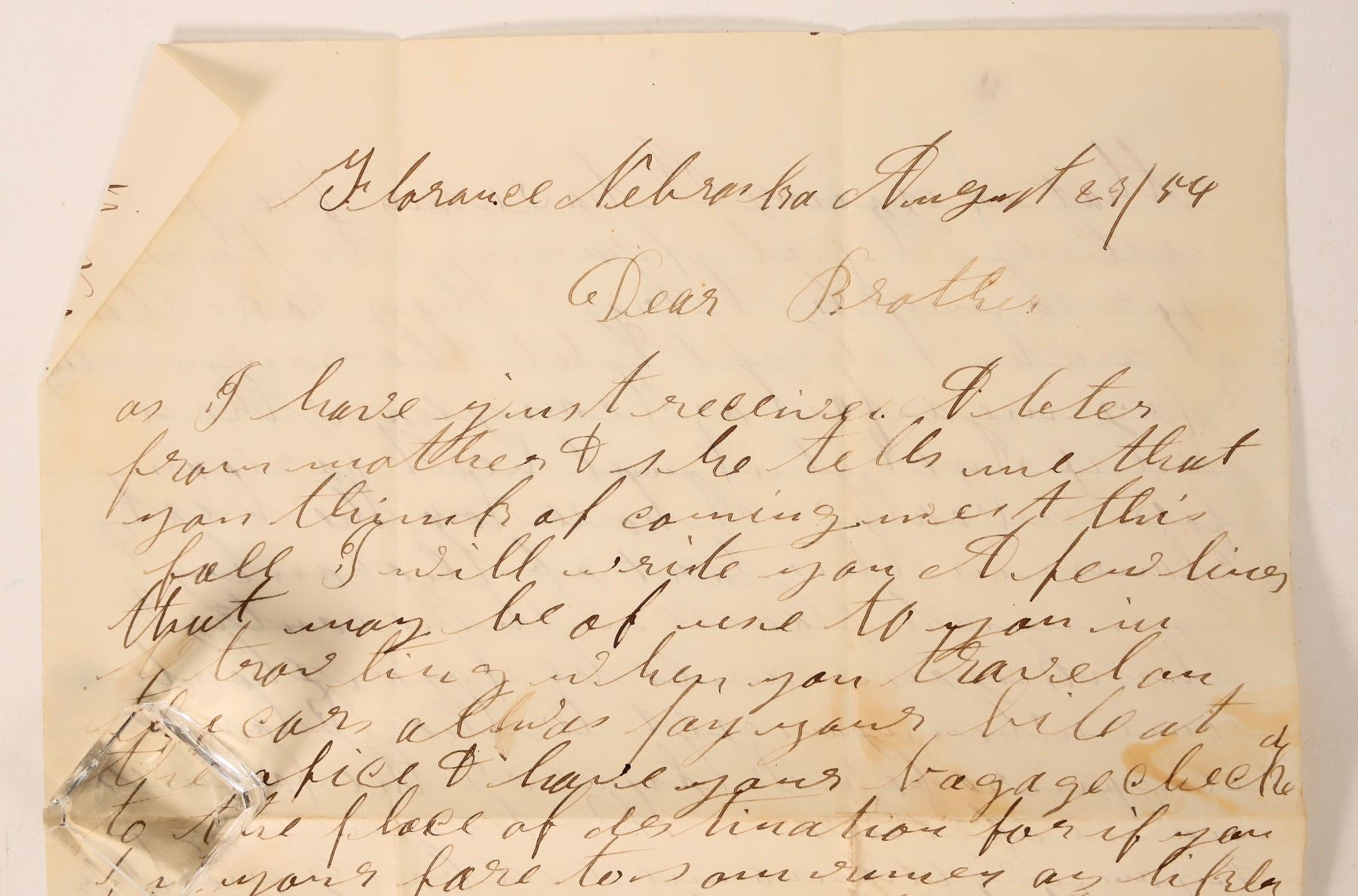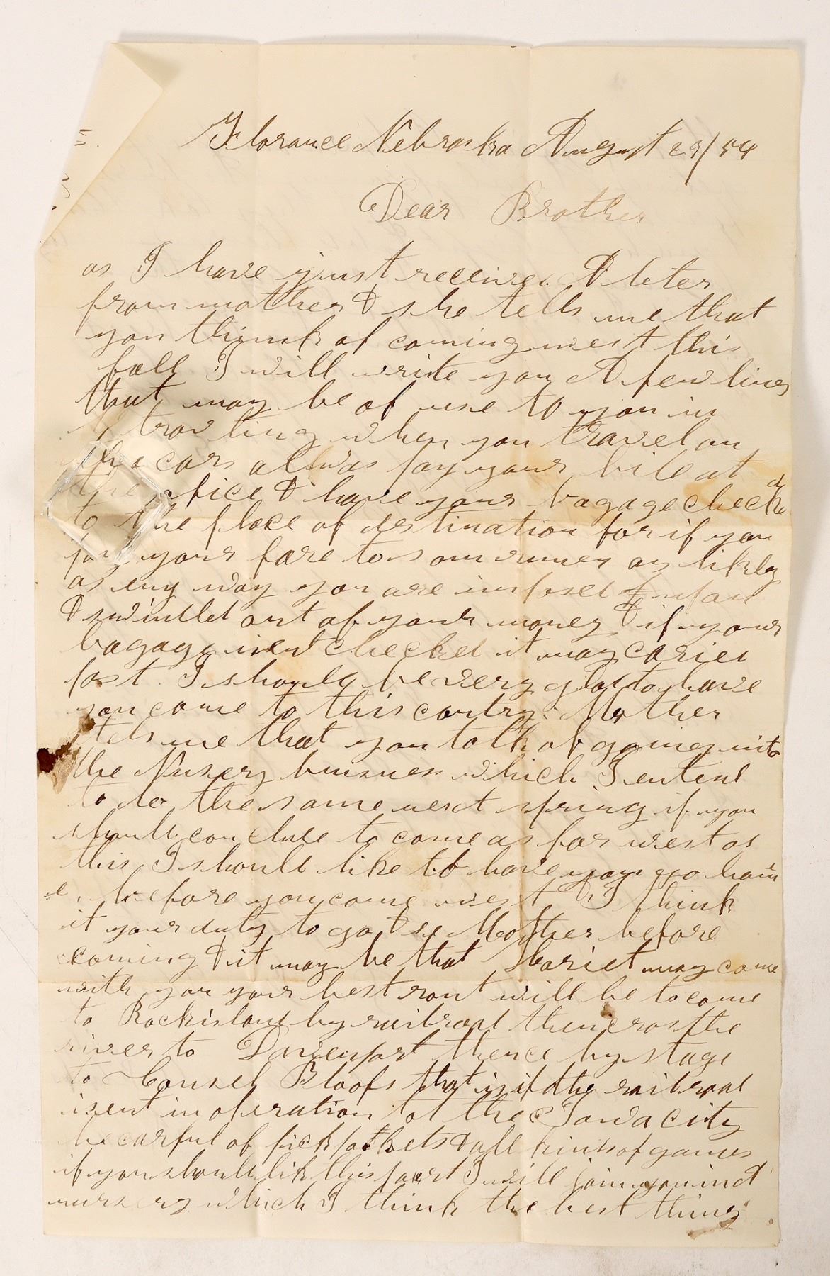 An 1854 letter from Florence, Nebraska resident D. B. Handy to his brother. Handy's brother had been considering moving west, and Handy wrote to him to give him advice on travel and settlement. His brother's desired final destination is unclear, but it seems that he intended to at least pass through Nebraska. [ Florence Nebraska