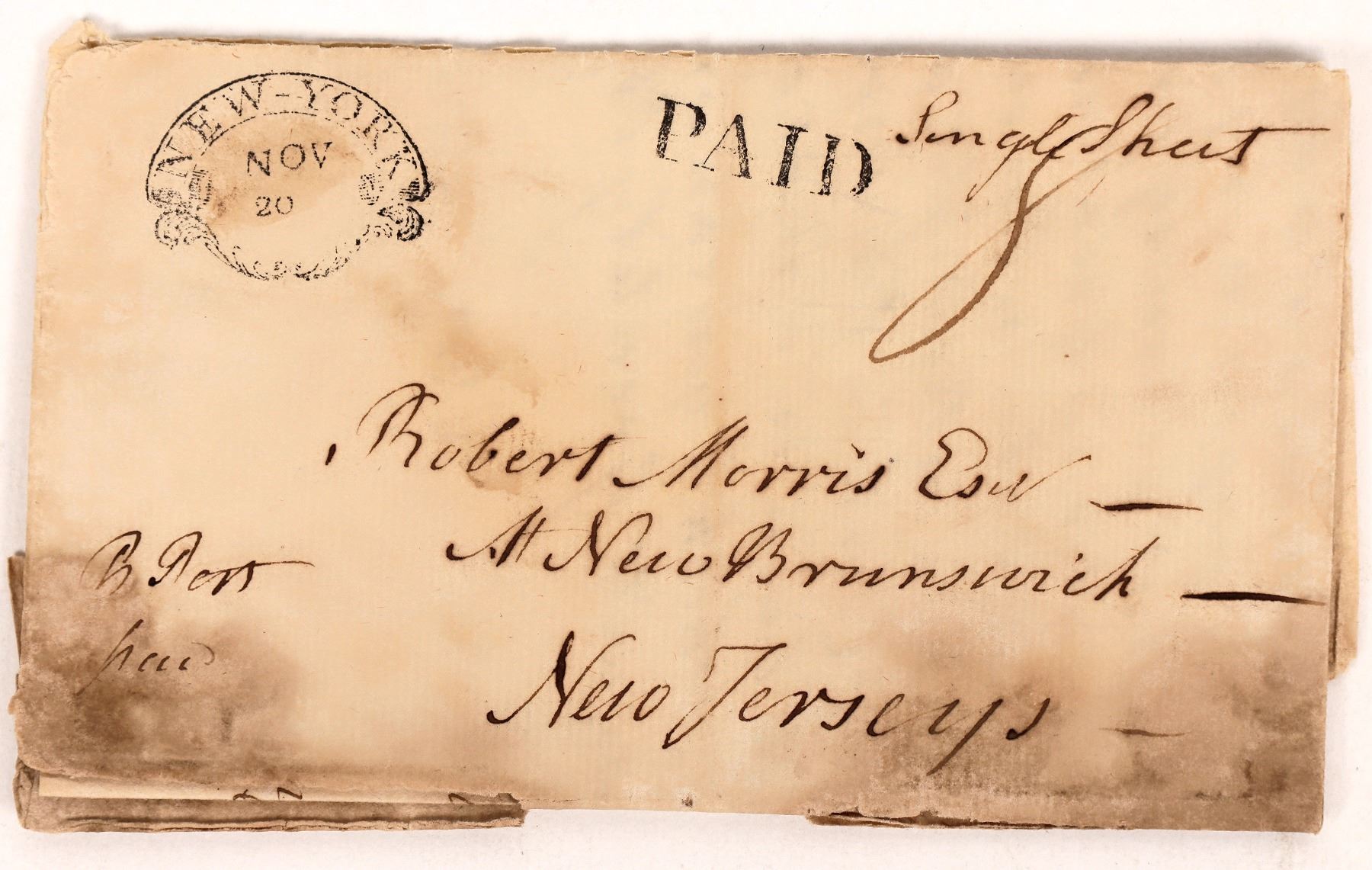 November 20, 1802 letter sheet PAID single sheet rate to New Jersey. Hand stamped fancy postmark. Addressed to Robert Morris Esz. at New Brunswick New Jersey. Robert Morris (1745 - June 2, 1815) was chief justice of the Supreme Court of New Jersey and a United States district judge of the United States District Court for the District of New Jersey, the United States District Court for the Eastern District of New Jersey and the United States District Court for the Western District of New Jersey. Morris received a recess appointment from President George Washington on August 28, 1790 to a seat on the United States District Court for the District of New Jersey vacated by the death of David Brearley. In 1789, President George Washington appointed Morris Secretary of the Treasury, but he declined the office and suggested Alexander Hamilton instead.