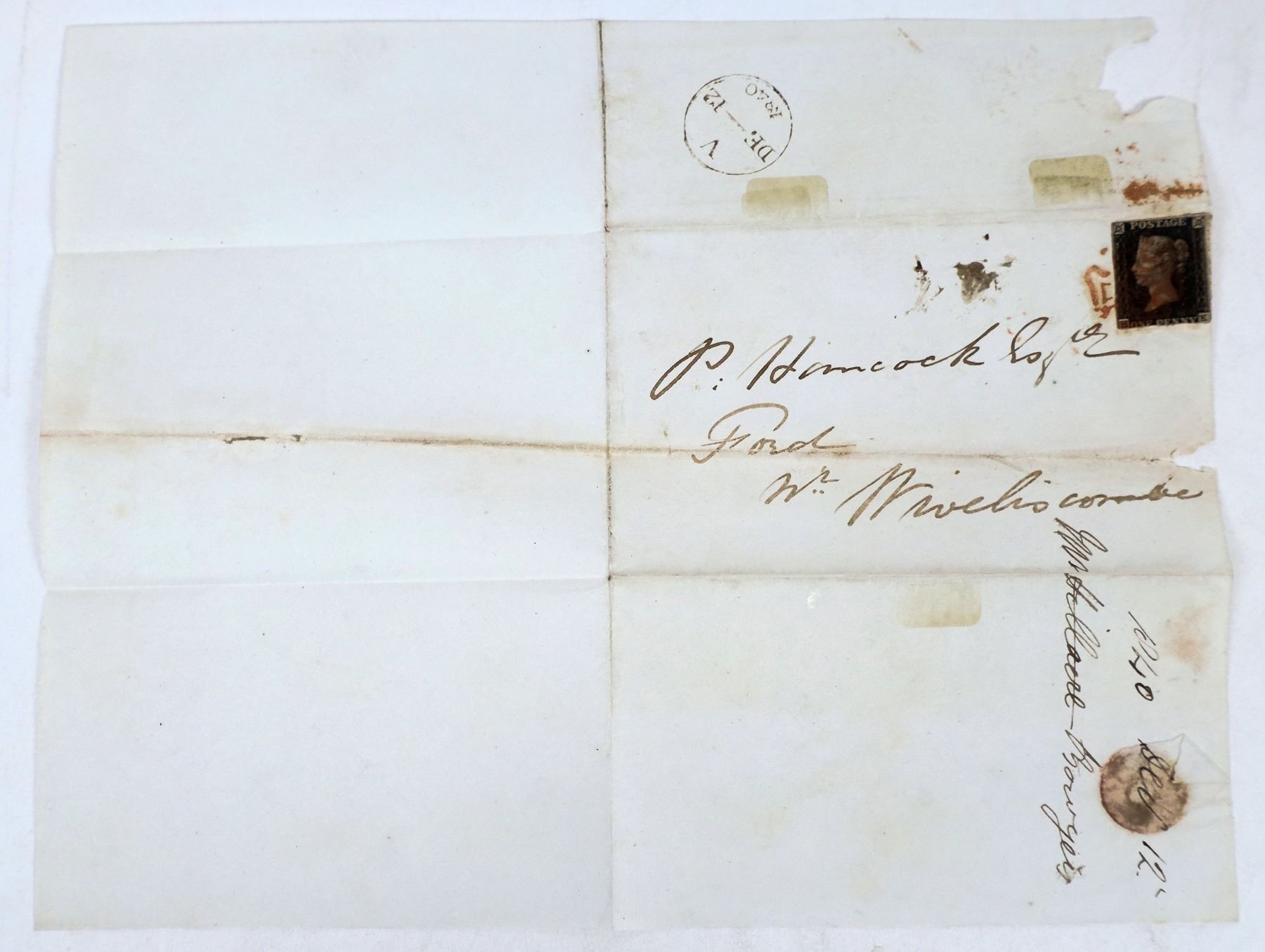 Great Britain. 1840 (December) lettersheet to "Ford nr. Wivelscombe" franked with 1840 1p intense black (Scott #1a, Plate 6, cutting at left and bottom) tied by red Maltese cross handstamp, cover small piece missing front only (neatly camouflaged when folded), the world's first postage stamp.