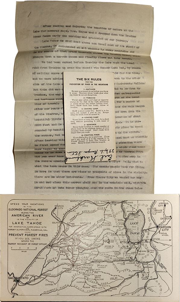 Four page typed letter detailing a trip to Lake Tahoe, Truckee, and the surrounding Sierra Nevada (Donner, Sierra City, Downieville, Nevada City). Describes the difficulty in driving an automobile on the primitive, steep road system, including an encounter with a stagecoach: "I have described this one event as a sample of what might be termed the leading objection to touring in this part of the Sierras." Hague's language and descriptions are at times romantic. He was clearly awed by the scenery. "The stillness of the solitude was broken by the steady roar of the Winton engines." He concludes, "We have decided that California is the country to tour in." Pencil notation on back indicates the trip was 1911. Also comes with a Forest Service card that details fire prevention steps and has a map of the Tahoe area. Please also see our Hague archive being offered.