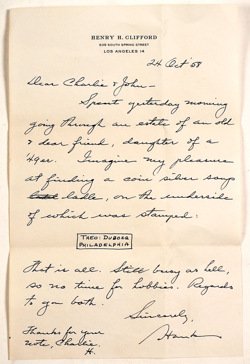 Letter to "Charlie & John regarding a coin silver soup ladle on the one side reading "Theo: Dubosq / Philadelphia. Date: 1958 Location: HWAC# 56762