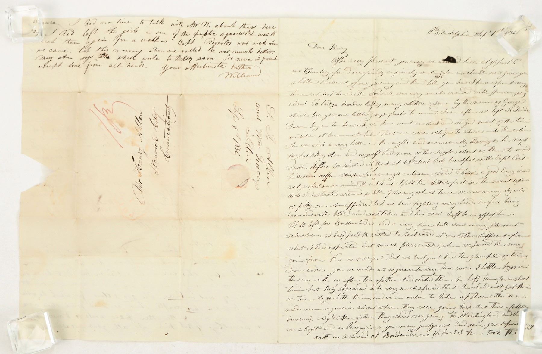 Dated September 1, 1836; stampless folded letter to Norwich, Connecticut. Three pages from Sarah T. Allen to her brother Henry Allen, telling in detail a trip to Philadelphia where they saw the U. S. Mint and watched them make money. The money bags were too heavy to lift and carry around. Much more about the trip through New York.