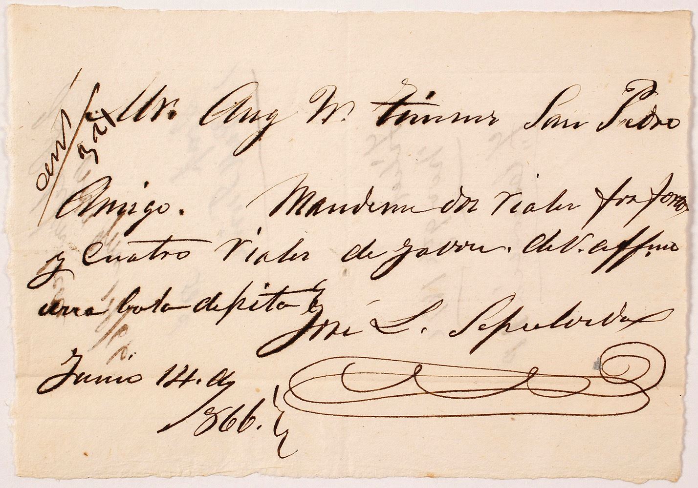 Jose Loreto Sepulveda was the mayor of Los Angeles from 1837 to 1848. He was the Grantee of the Rancho de los Palos Verde. Note is dated June 14, 1866. This is an important and historic California signature. Date: 1866 Location: San Pedro, California HWAC# 58381