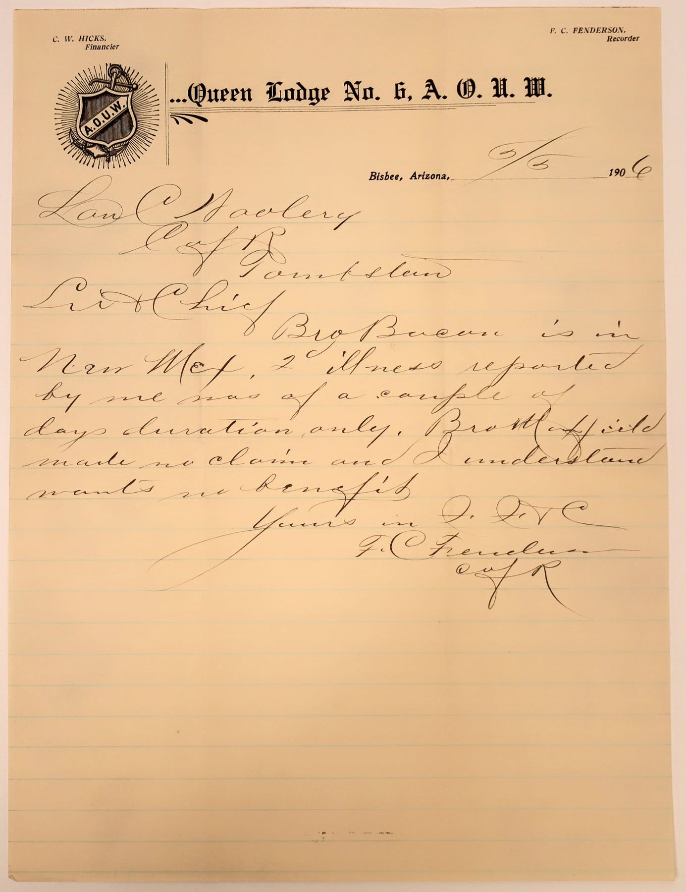 June 6, 1906 letterhead of "Queen Lodge No. 6, A.O.U.W. Letter concerns the illness of a member in New Mexico. The Ancient Order of United Workmen (AOUW) was a fraternal organization in the United States and Canada, providing mutual social and financial support after the American Civil War. It was the first of the "fraternal benefit societies", organizations that would offer insurance as well as sickness, accident, death and burial policies.
