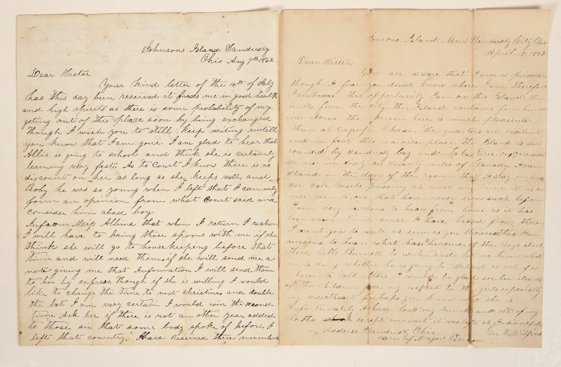 A pair of letters from George H. Wilford, a Confederate soldier held prisoner on Johnson's Island in Lake Erie. The letters both date from 1862 and are addressed to his sister. Despite his imprisonment, Wilford doesn't seem to be too distressed; he opens his first letter with a straightforward "You are aware that I am a prisoner, though I fear you do not know where I am" and goes on to tell his sister that "the quarters are excellent, and in fact this is a nice place." The letters provide an interesting firsthand look inside Johnson's Island, which was a notorious prison for Confederate soldiers with more than 15,000 men being held there during the prison's operation. Both letters have some tearing and wear along their creases, but both remain full legible and intact.