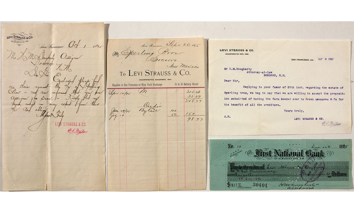 Lot of 4 items pertaining to the same event. 1) September 2: letterhead from Strauss & Co. in San Francisco to H. M. Dougherty agreeing to the proposition that Brown Menzares & Co. take over for the Sperling Bothers "For the benefit of all the creditors." 2) September 30: Bill for $98.77 against the Sperling Brothers. 3) October 1: Letterhead from Strauss & Co asking to reimbursed for the money owed them. 4) December 26: Check from Dougherty to $17.22 to Strauss & Company. I assume it was the amount they were able to collect from the Sperling Brothers. The 1884 Socorro Chieftain states that they have a "mammoth double store." Interesting grouping!