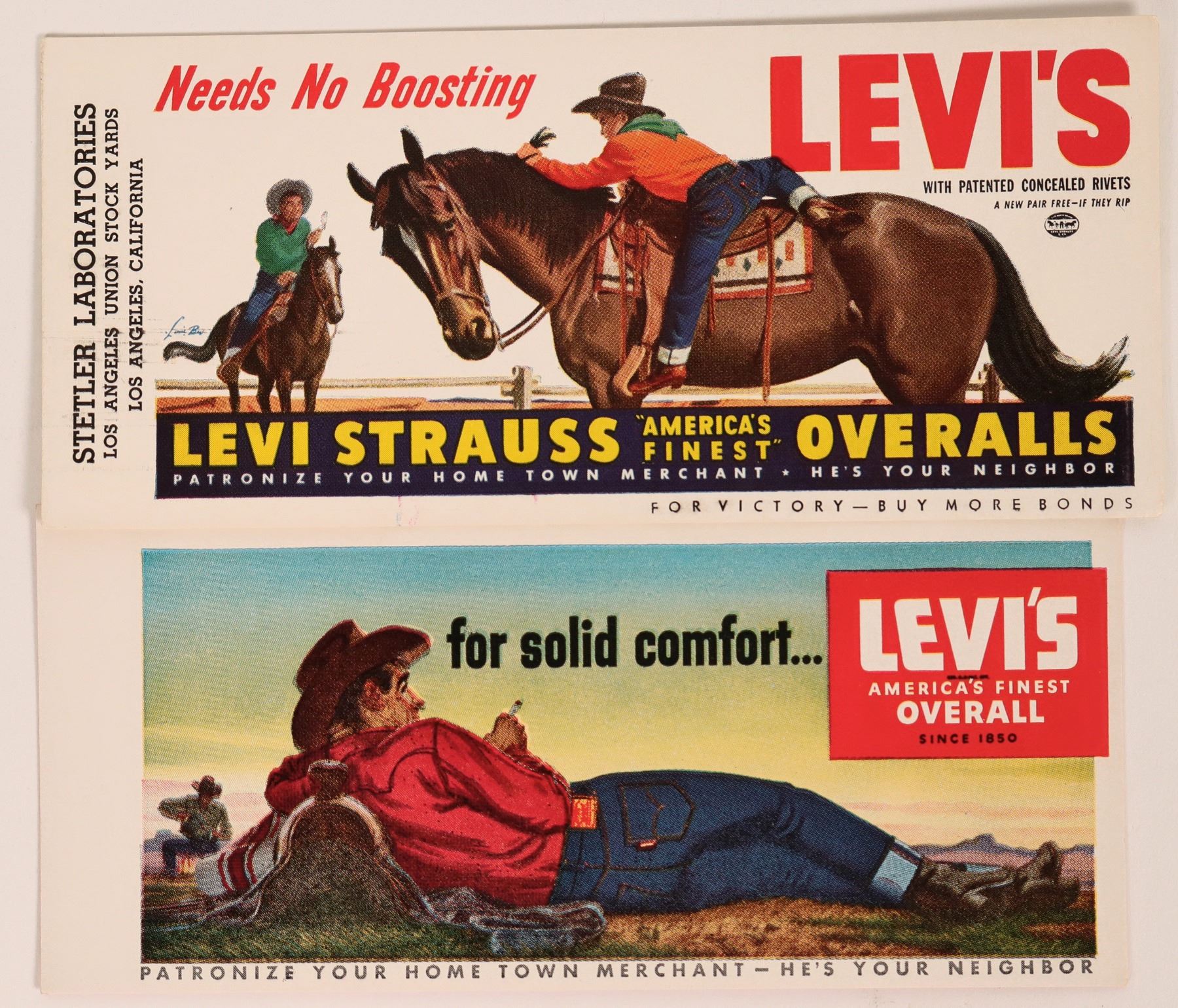 A fun and vibrant duo of advertisement blotters for Levi Strauss, "America's Finest" Overalls. One features a scene of cowboys in their Levi's on horseback. The other blotter features a cowboy in repose in the prairie in his Levi's. See photos for the artwork.