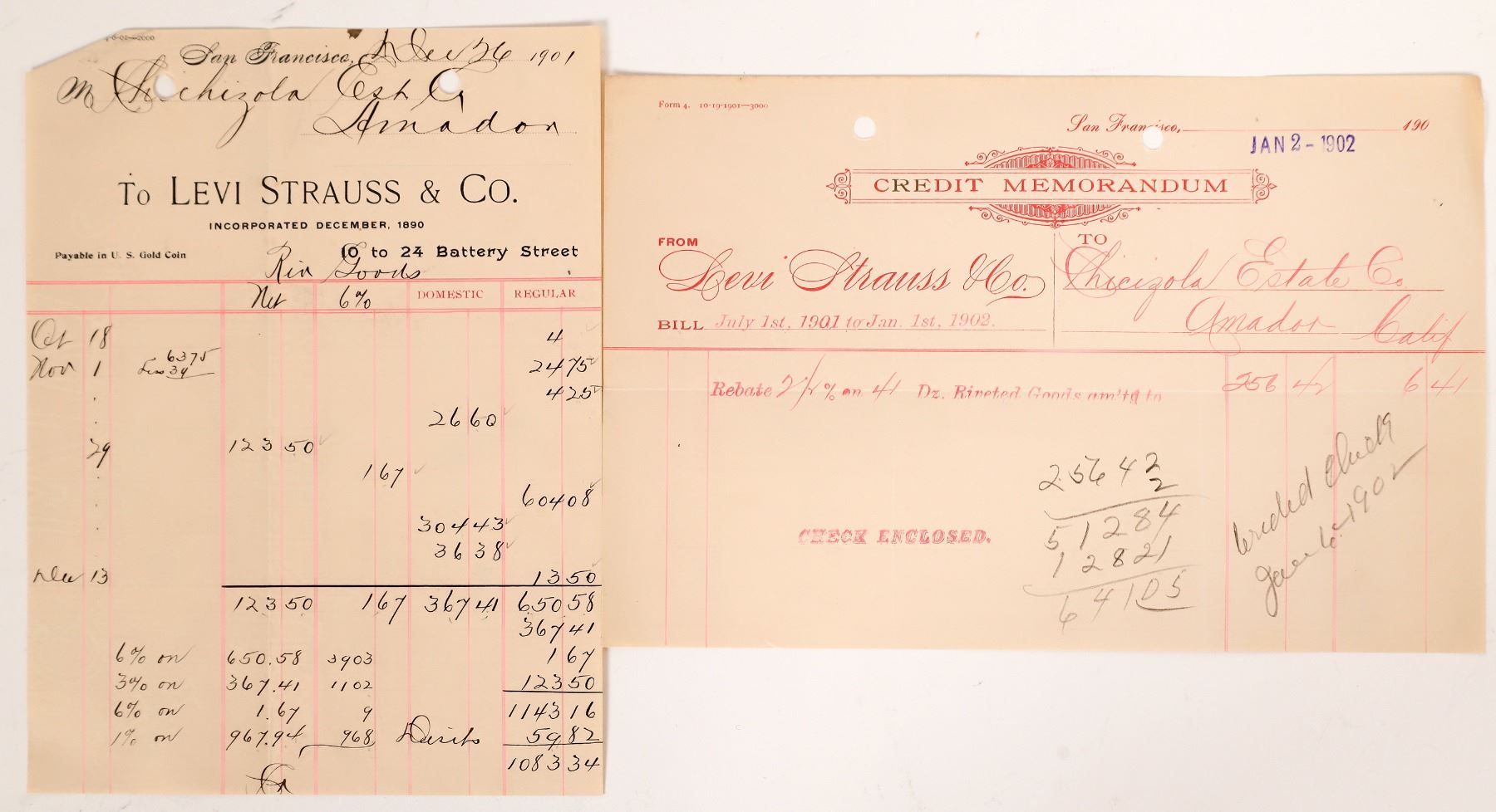 2 different Levi Strauss billheads, c. 1901-02. Horizontal credit memo references riveted goods. California San Francisco