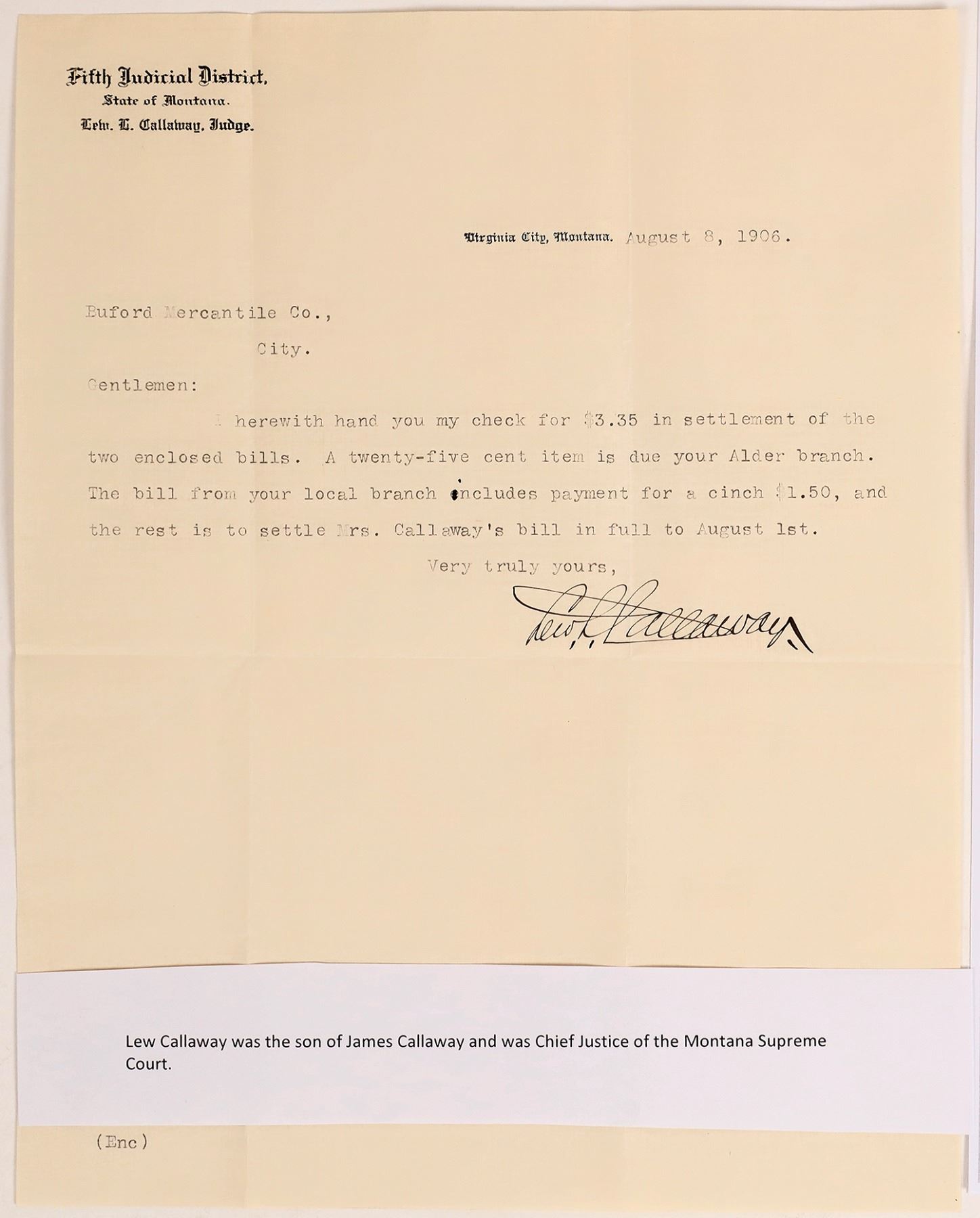 1906 Lew L Callaway autograph signed letter. Chief Justice, Montana Supreme Court,_x000D_