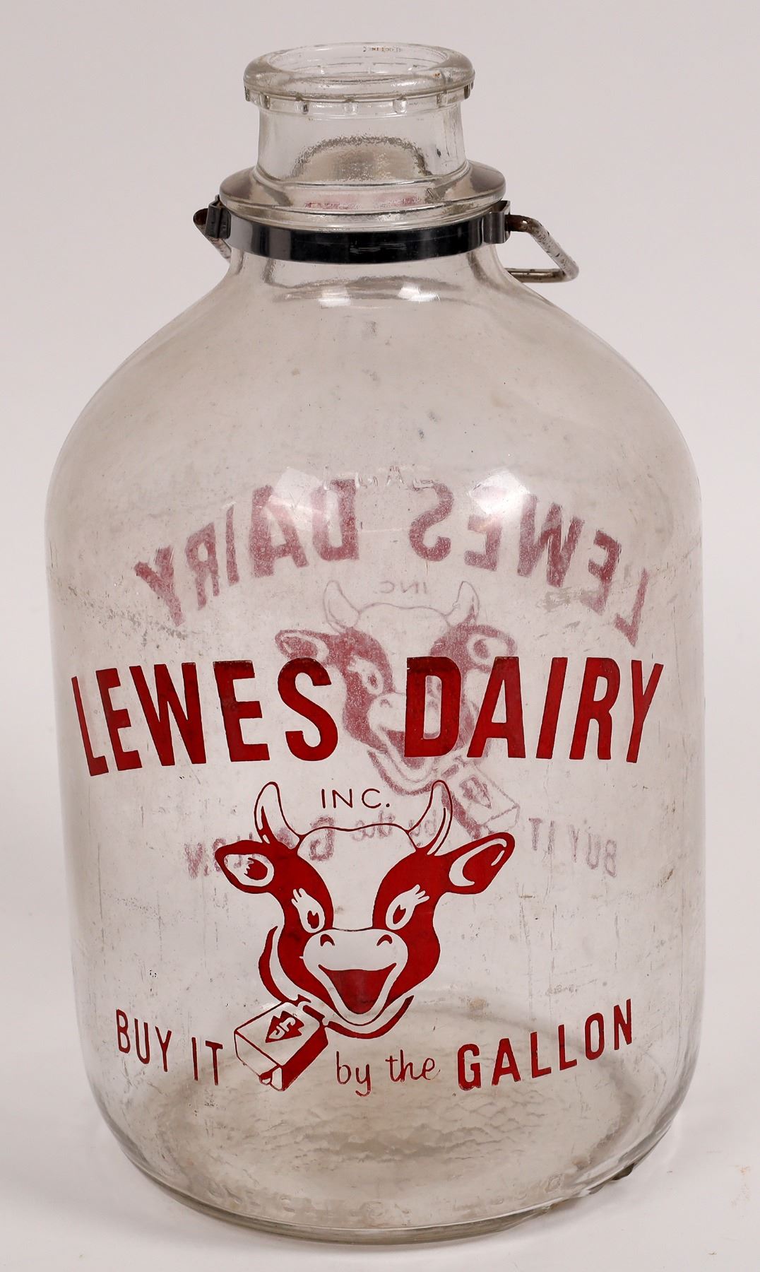Gallon milk jug with handle, pyro logo with cow face and bell. c. 1940's. 11.25". Case wear, handle rust, 1.25" base chip. Please inspect. Delaware Lewes Lewes Delaware