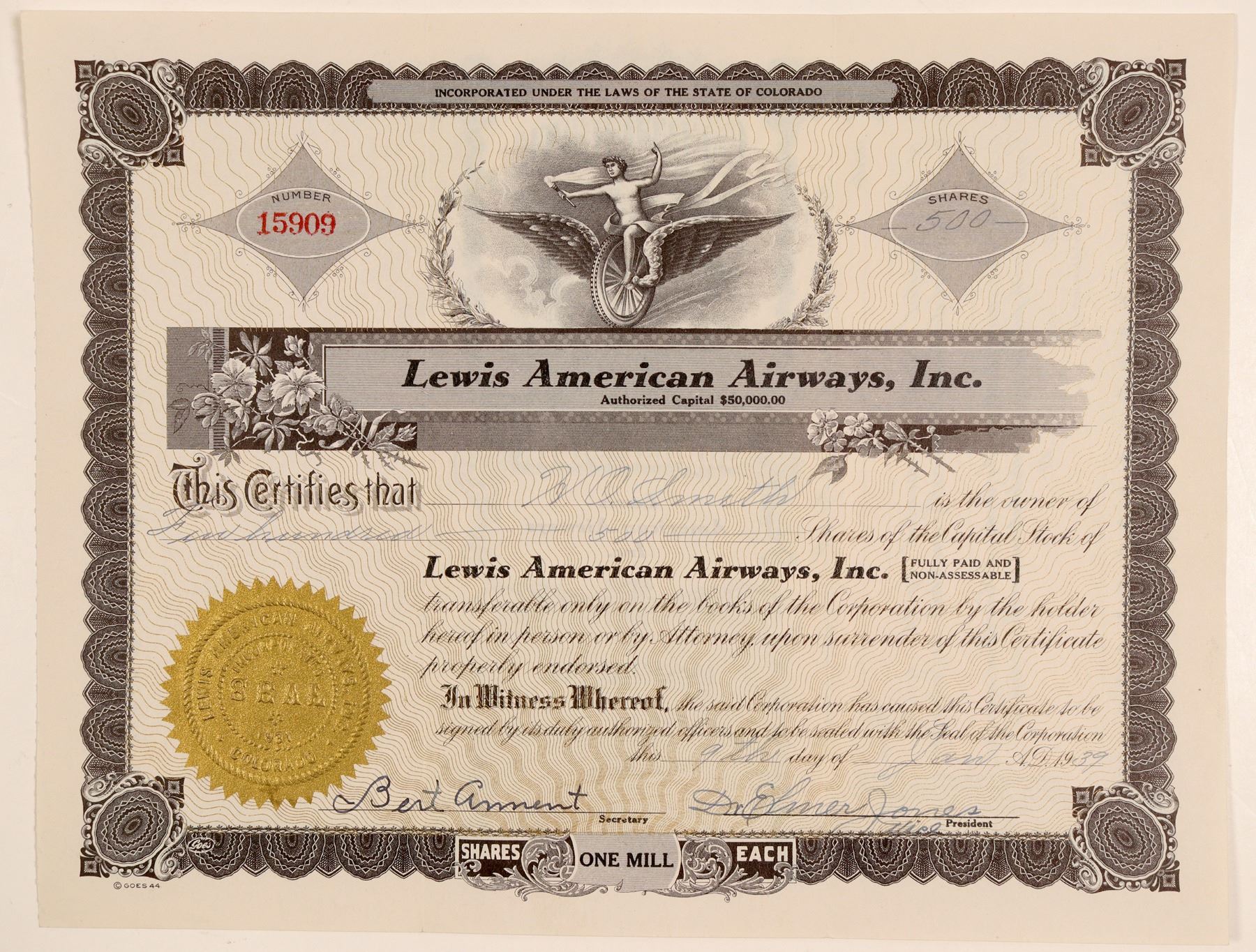 Inc. in Colorado. No. 15909, issued for 500 shares to H.O. Smith on Jan. 9th, 1939. Signed by vice-president Dr. Elmer Jones and secretary Bert Annent. Not cancelled. Black border and print, floral logo, gold seal, and allegorical vignette of man carry torch on a wheel with wings. Printed by Goes. Folds. 8.25 x 10.75" Paul M. Lewis designed the three-wheeled, five-passenger "Airomobile" car in 1937. The engine was designed by engineers Carl Doman and Ed Marks of the Franklin Automobile Co. Lewis had a prototype built which he drove across the country to advertise, but with the start of World War II, the car never took off or went into production. Ken Prag Collection