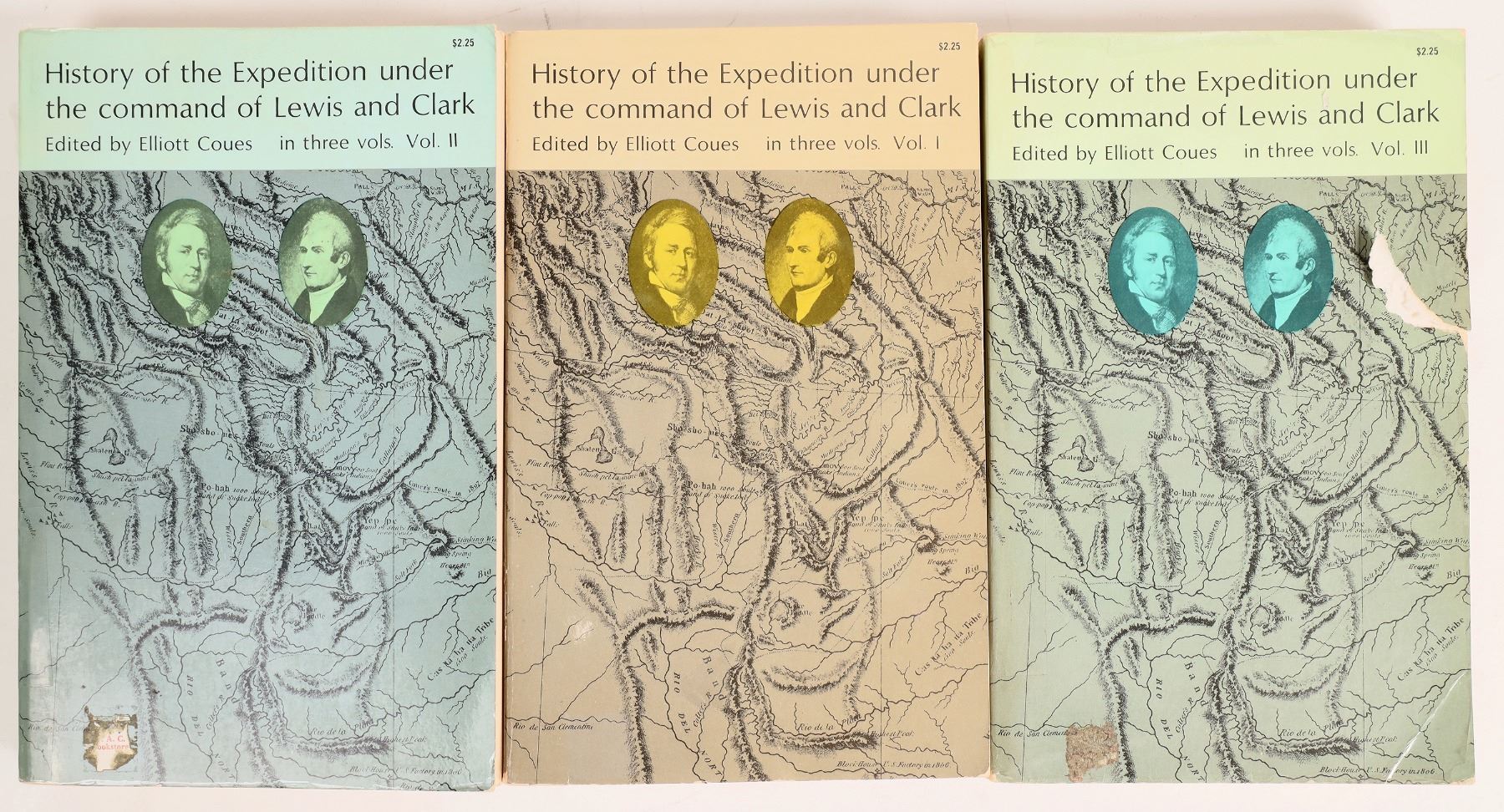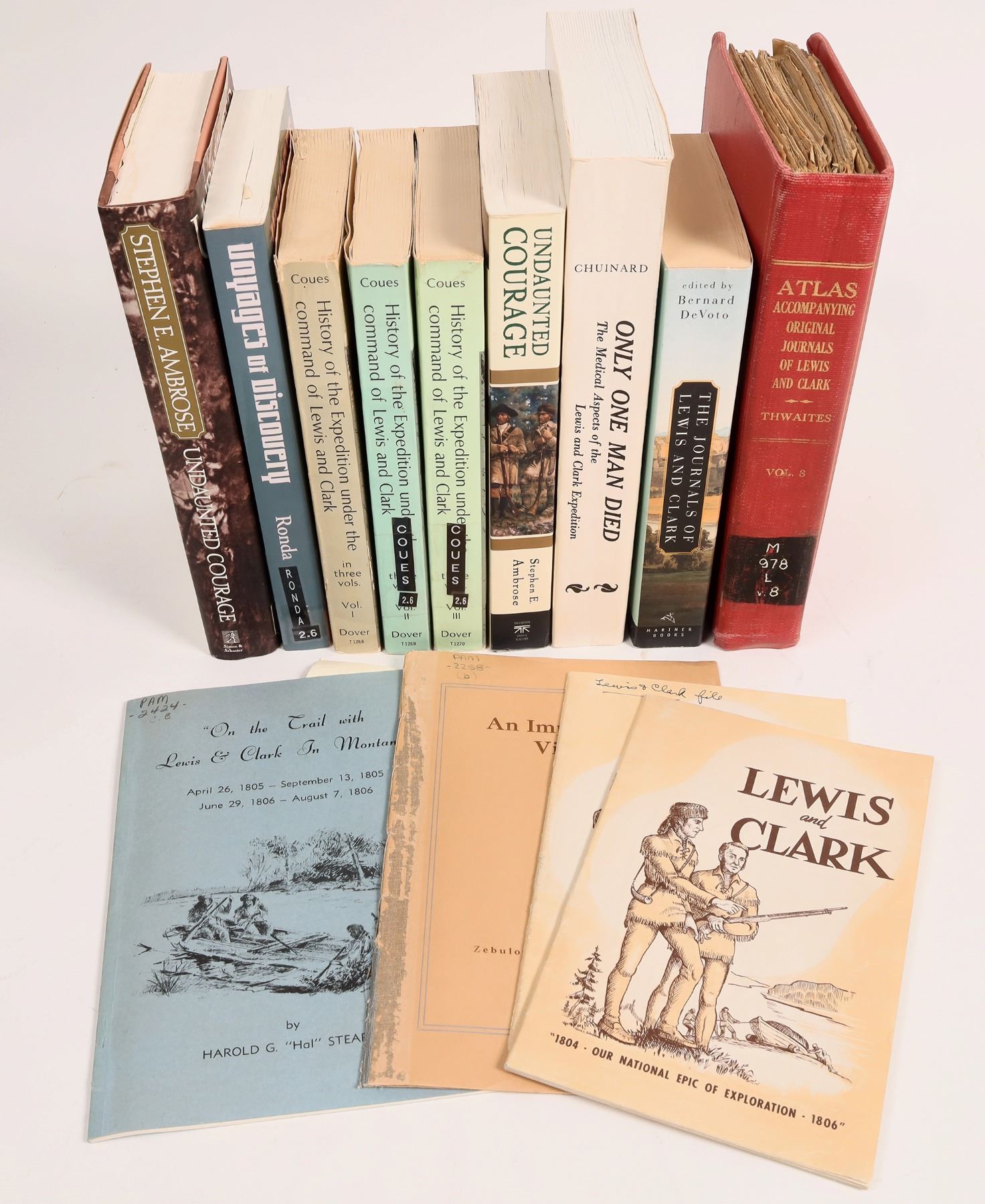 13 Lewis and Clark books. "The Lewis and Clark Expedition, also known as the Corps of Discovery Expedition, was the United States expedition to cross the newly acquired western portion of the country after the Louisiana Purchase." from Wikipedia. 2x Undaunted Courage by Ambrose. An Important Visit by Pike. On the Trail with Lewis and Clark in Montana by Stearns. History of the Expedition under Lewis and Clark by Couse with foldout map, Vols. 1-3. Voyages of Discovery by Ronda. Atlas Accompanying Original Journals of Lewis and Clark by Thwaites, Vol. 8, loaded with foldout maps. 2x Lewis and Clark, Our National Epic of Exploration 1804-1806 by Stevens. Only One Man Died by Chuinard. The Journals of Lewis and Clark by Devoto.