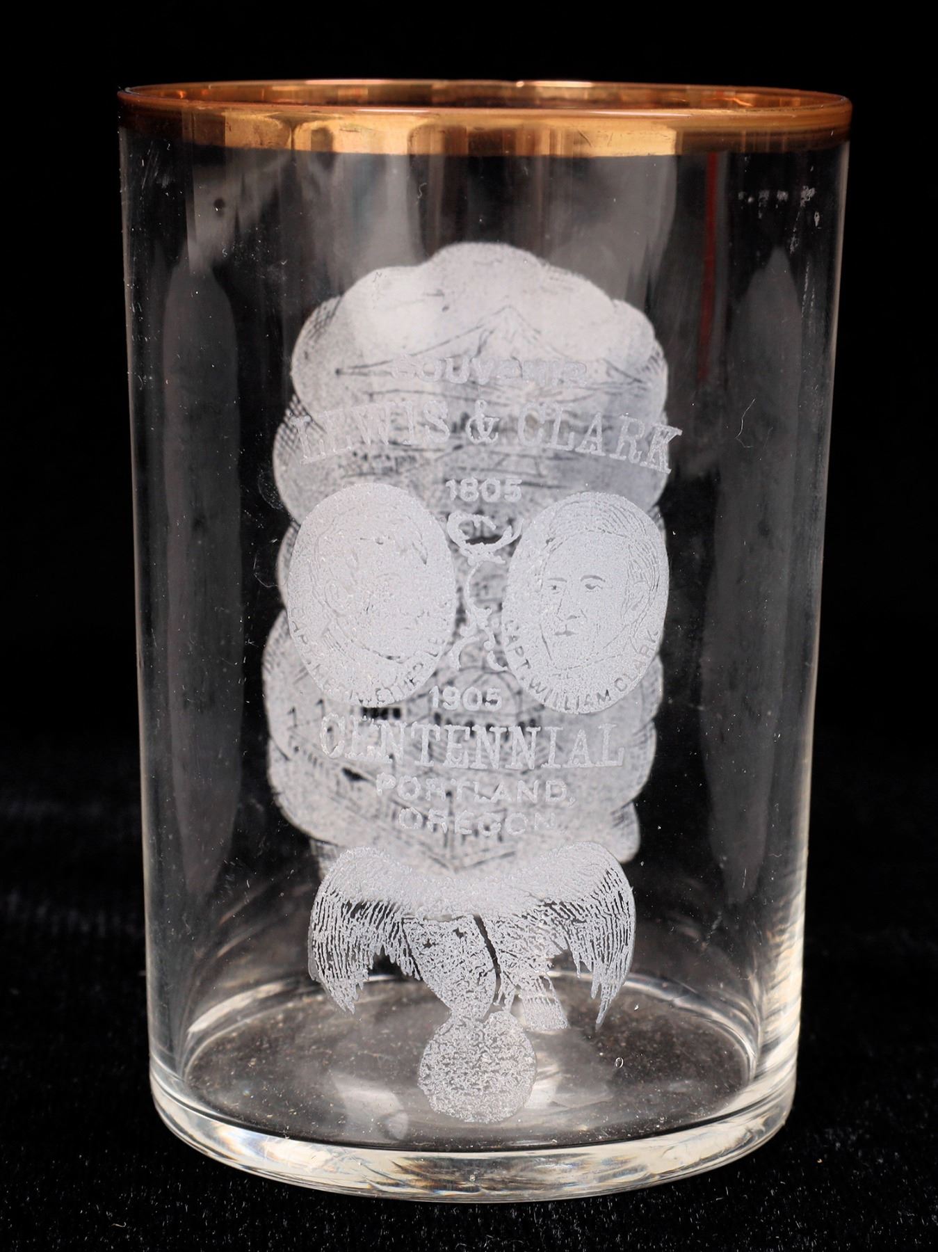 Dual side etched with gold leaf rim, Souvenir/Lewis & Clark/1905/Centennial/Portland, Oregon. 3.75". Tiny upper lip chip. Oregon Portland
