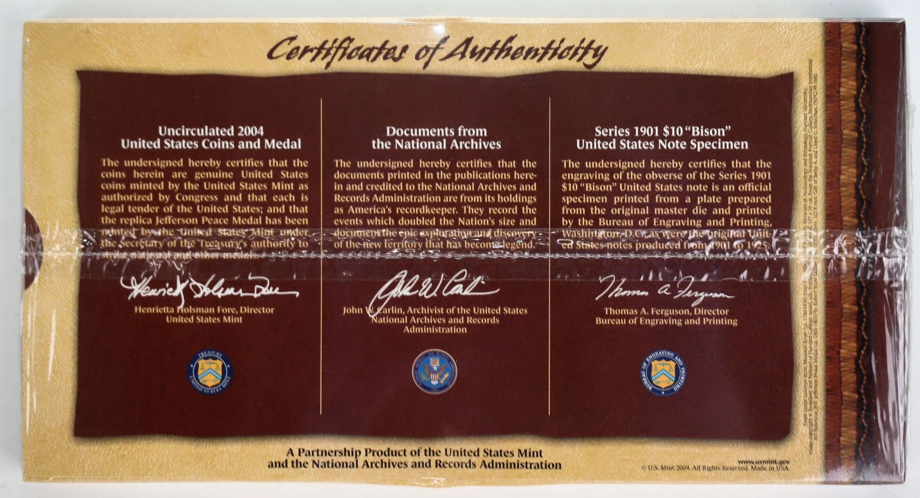 In original sealed U. S. Mint packaging: 2004 Lewis and Clark coinage and currency set, containing uncirculated 2004 United States Coins and medal; Documents from the National Archives; Series 1901 $10 "Bison" United States Note Specimen. Set comes with four coins: the peace nickel, keelboat nickel, Sacagawea Dollar and the Lewis & Clark Bicentennial silver dollar. Also a pamphlet on the Louisiana Purchase and a pamphlet on the Lewis and Clark Expedition, replica of the peace medal and Lewis and Clark postage stamps, in a colorful slide box.