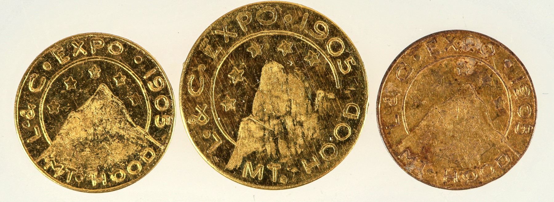 When Portland staged the Centennial Celebration of the Lewis and Clark Exposition in 1905, Farran Zerbe marketed these gold coins "as novel companions to the Lewis and Clark souvenir dollar" which Zerbe was selling for the U. S. Mint. Here are three pieces: two are "1/4" (10 mm; 0.2 grams); one is "1/2" (12 mm; 0.3 grams). Two are AU-BU; one is EF-AU. Obverse: