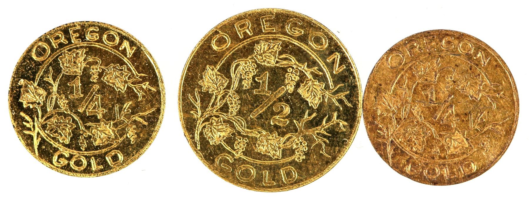 Fraction 1/2 (1/4) within a wreath of indeterminate branches. Lettering: OREGON / GOLD.