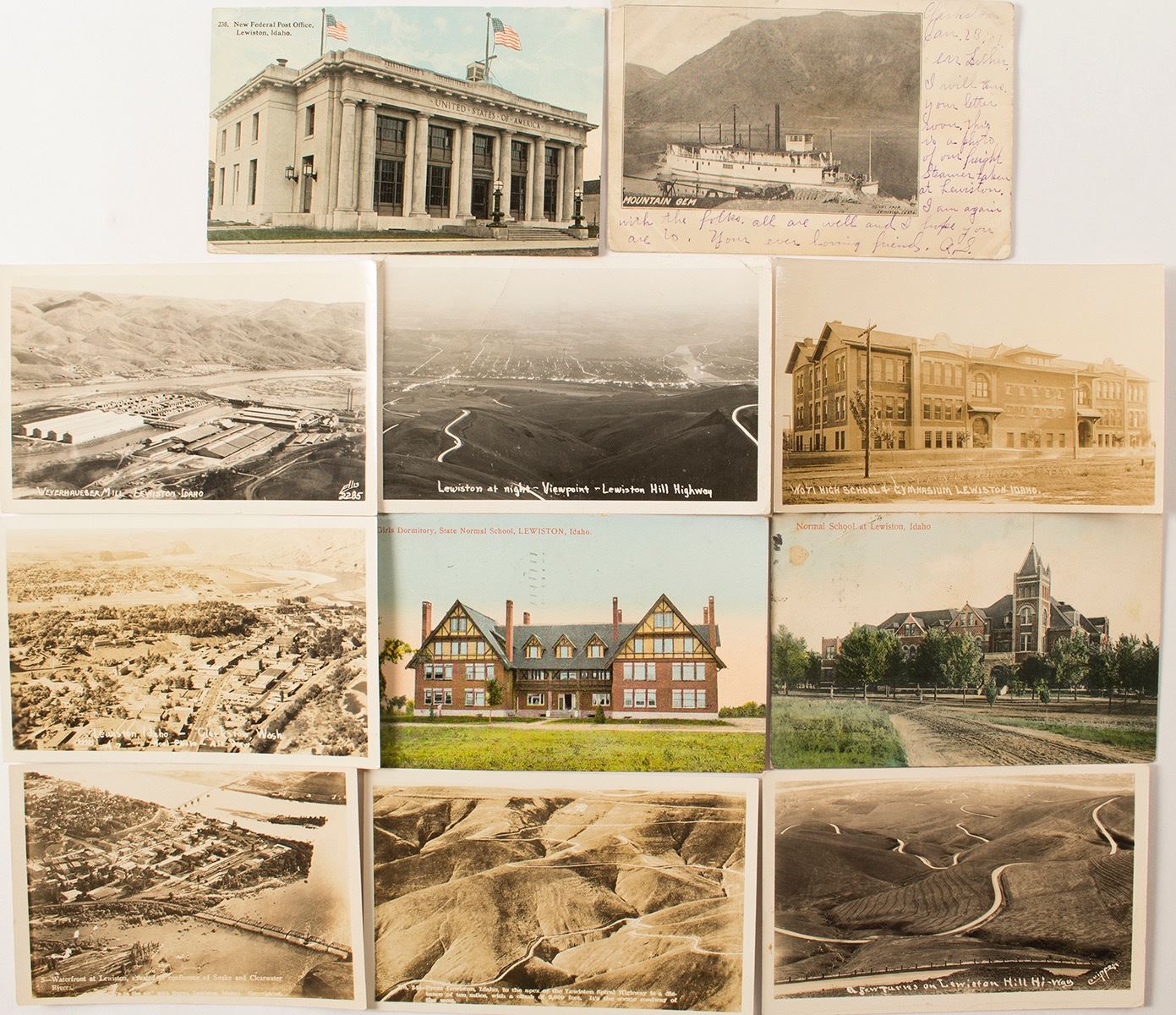 1907-1958. Lot of eleven. Seven black & white real photo postcards. Cards include Normal school, post office, steamer (photo by Henry Fair of Lewiston), waterfront, Weyerhauser Mill with Clarkson Washington in background, high school, several Lewiston Hills. Date: 1907-1959 Location: Lewiston, Idaho HWAC# 54515