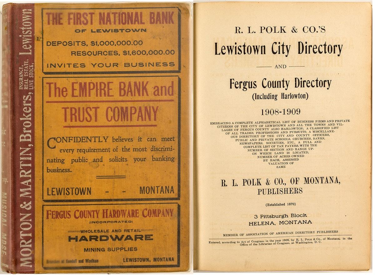 This is perfect for token and postal history collectors. This one is in great shape - with a strong spine and covers are all strongly attached. Typical Lewistown Directory: business directory, alphabetical directory, officers, organizations, and a short history. Includes all of Fergus County and Judith. Starts with Armells (69 entries almost all stockmen or farmers) and ends with Yale (16 entries). These directories are also great for the rural towns and ranchers in the area. City: Lewistown State: Montana Date: 1908 ID: 36769